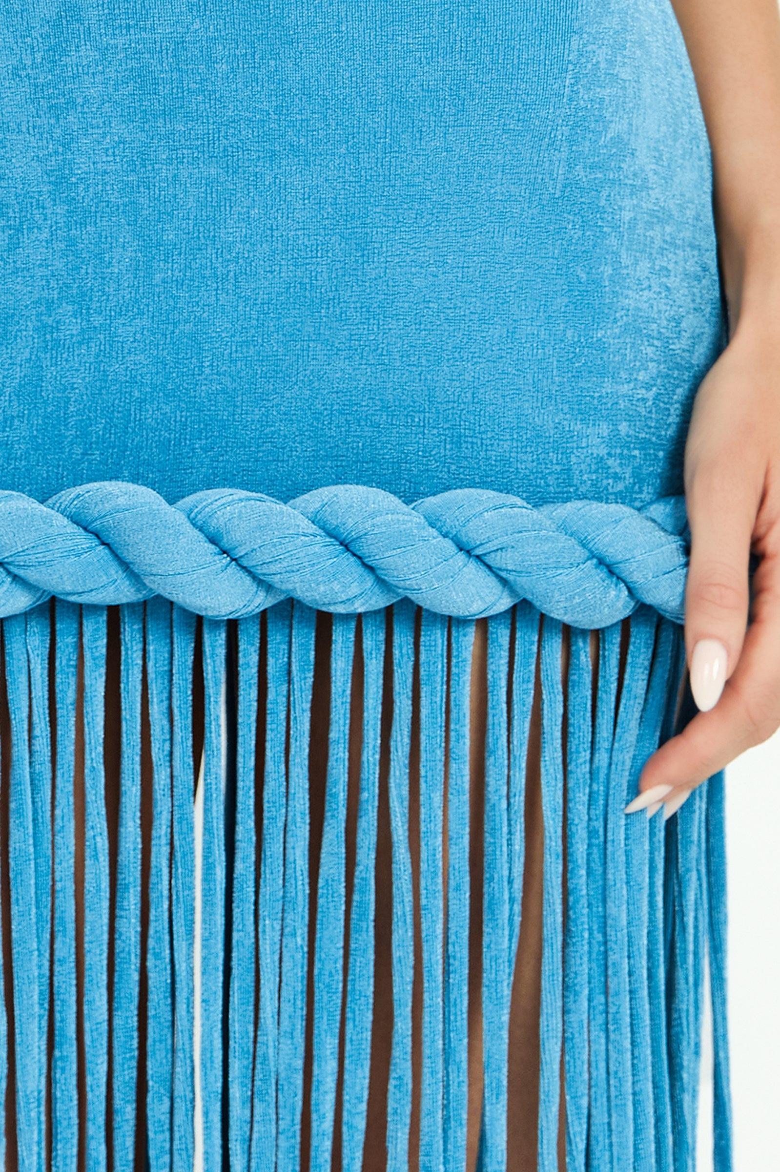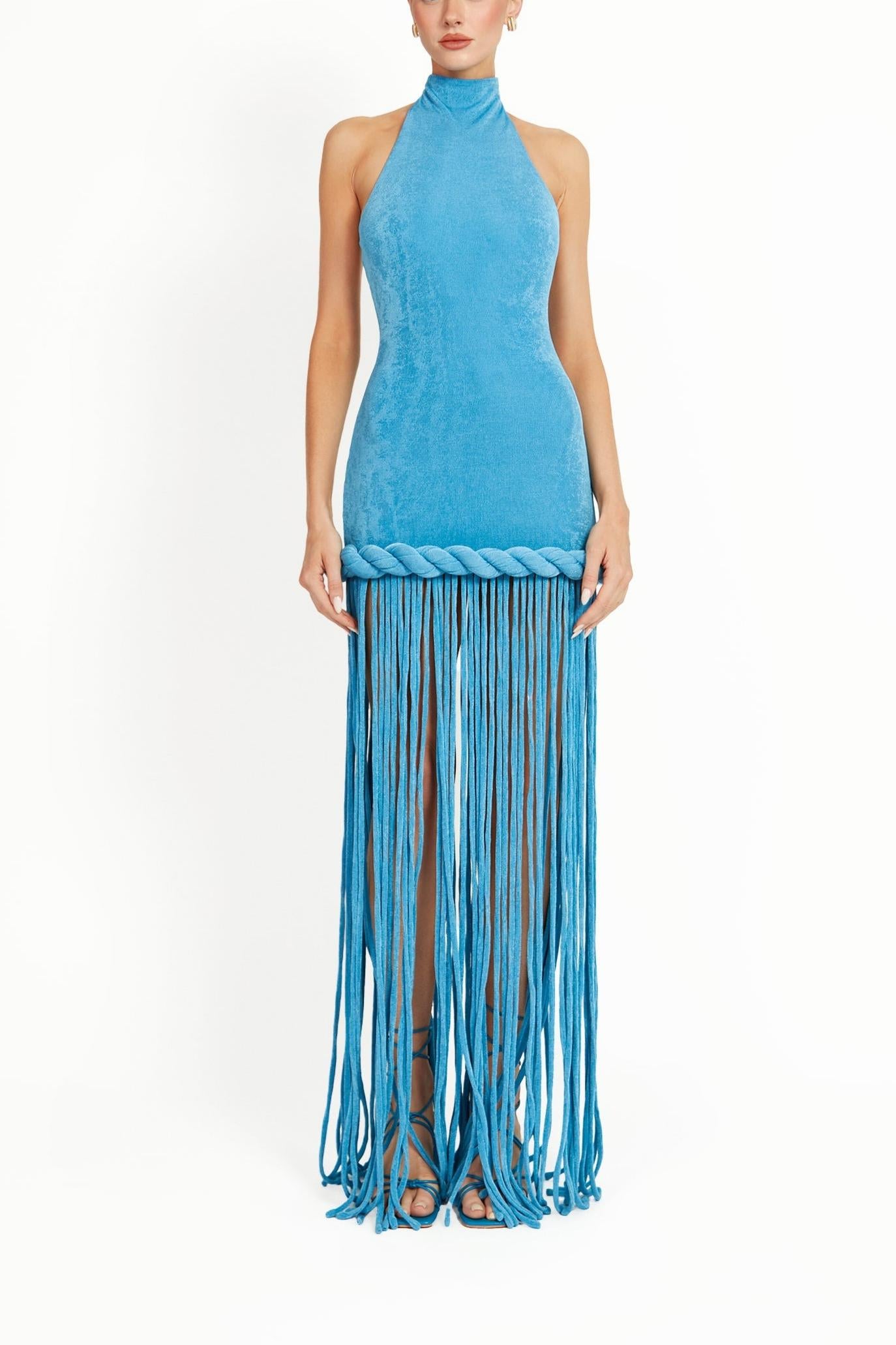 Azure Wave Halter Fringe Maxi Dress
