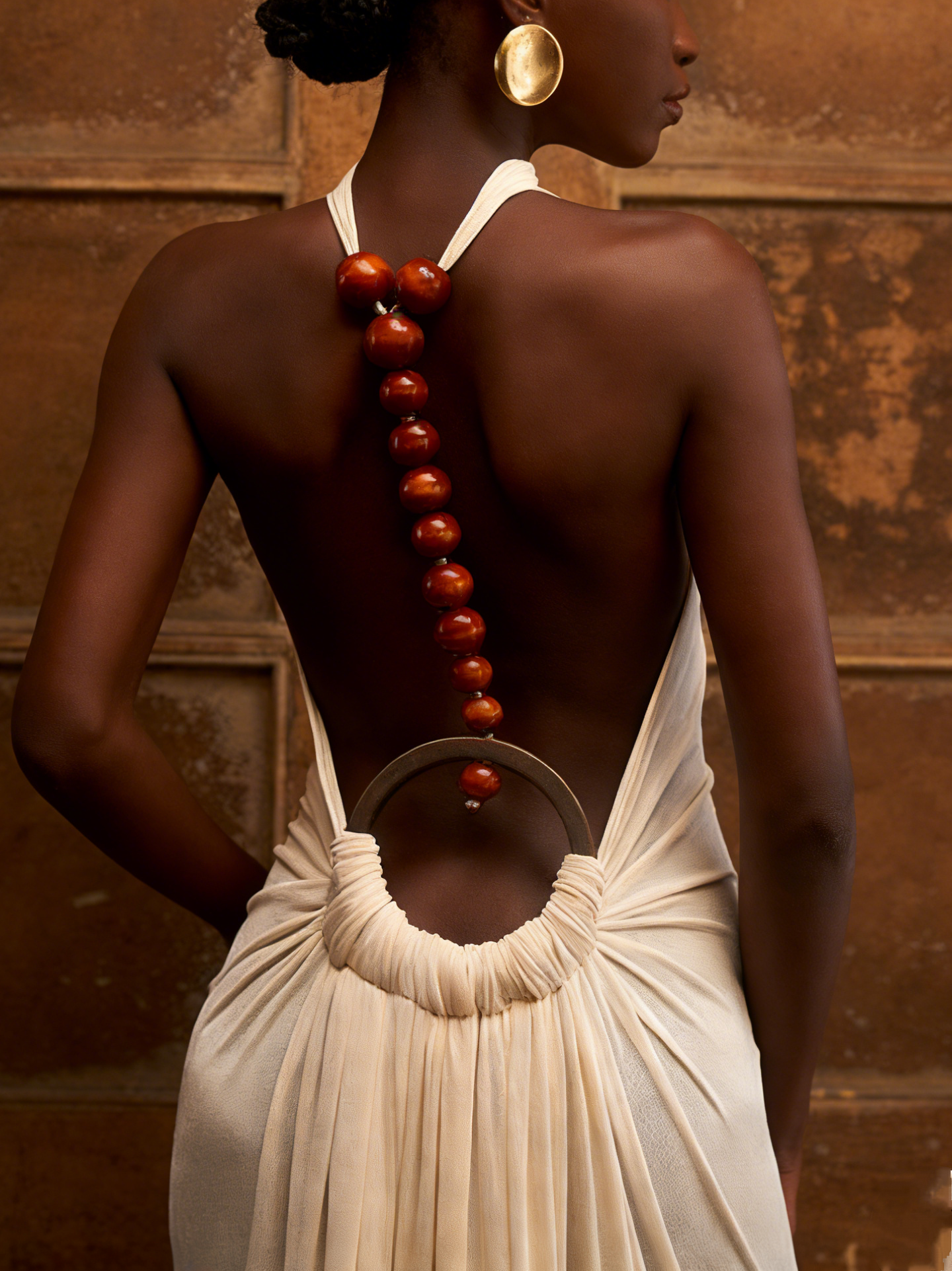 The Beaded Backless Cutout & Fringe Hem Satin Bodycon Party Gown is a statement in sculptural elegance. Cut from fluid jersey that hugs the body and falls into a soft, dramatic drape, this dress is defined by its sensuous halter neckline and bold, open back. A sculpted spine of wooden beads and a wooden ring detail anchor the back, tracing the line of the spine and drawing the eye with every step.