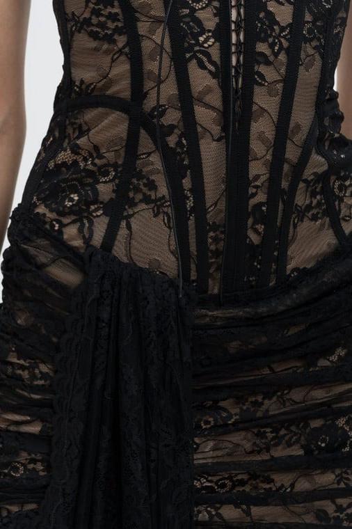 Black Lace Corset Mini Dress with Asymmetric Drape