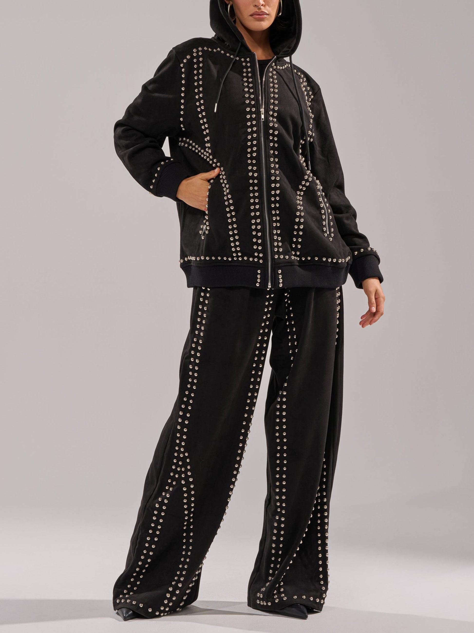 Black Studded Hoodie & Wide-Leg Pants 2-Piece Set