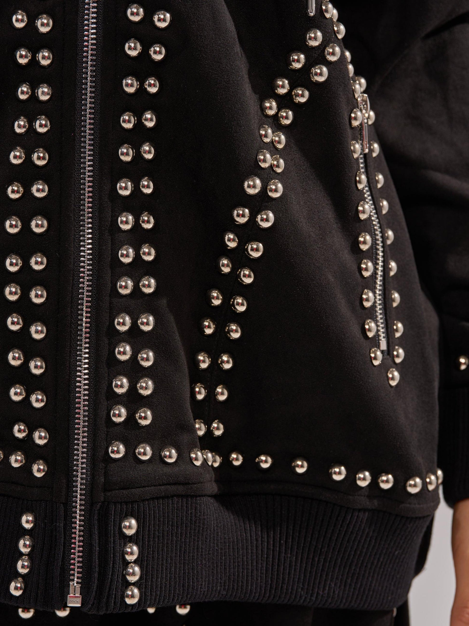 Crafted from velvety faux suede, this piece boasts silver-tone stud detailing lining the front hemlines, an attached hood with drawstring closures, long sleeves with ribbed knit cuffs, a coordinating hemline, a front zip closure, and zippered waist pockets. Complete with a spacious, slightly oversized fit.