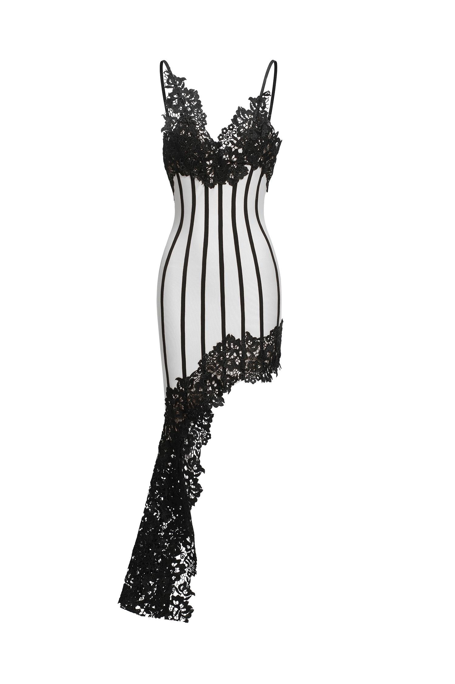 Crafted from our signature stretch bandage fabric, this dress sculpts and lifts your figure for a flawless, curve-hugging fit that lasts all night. The bold vertical black-and-white stripes create a dramatic, elongating effect, while the intricate black floral lace trim at the plunging V-neckline and asymmetric hem adds a romantic, feminine contrast.