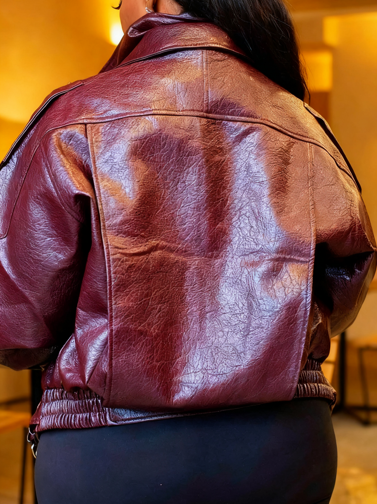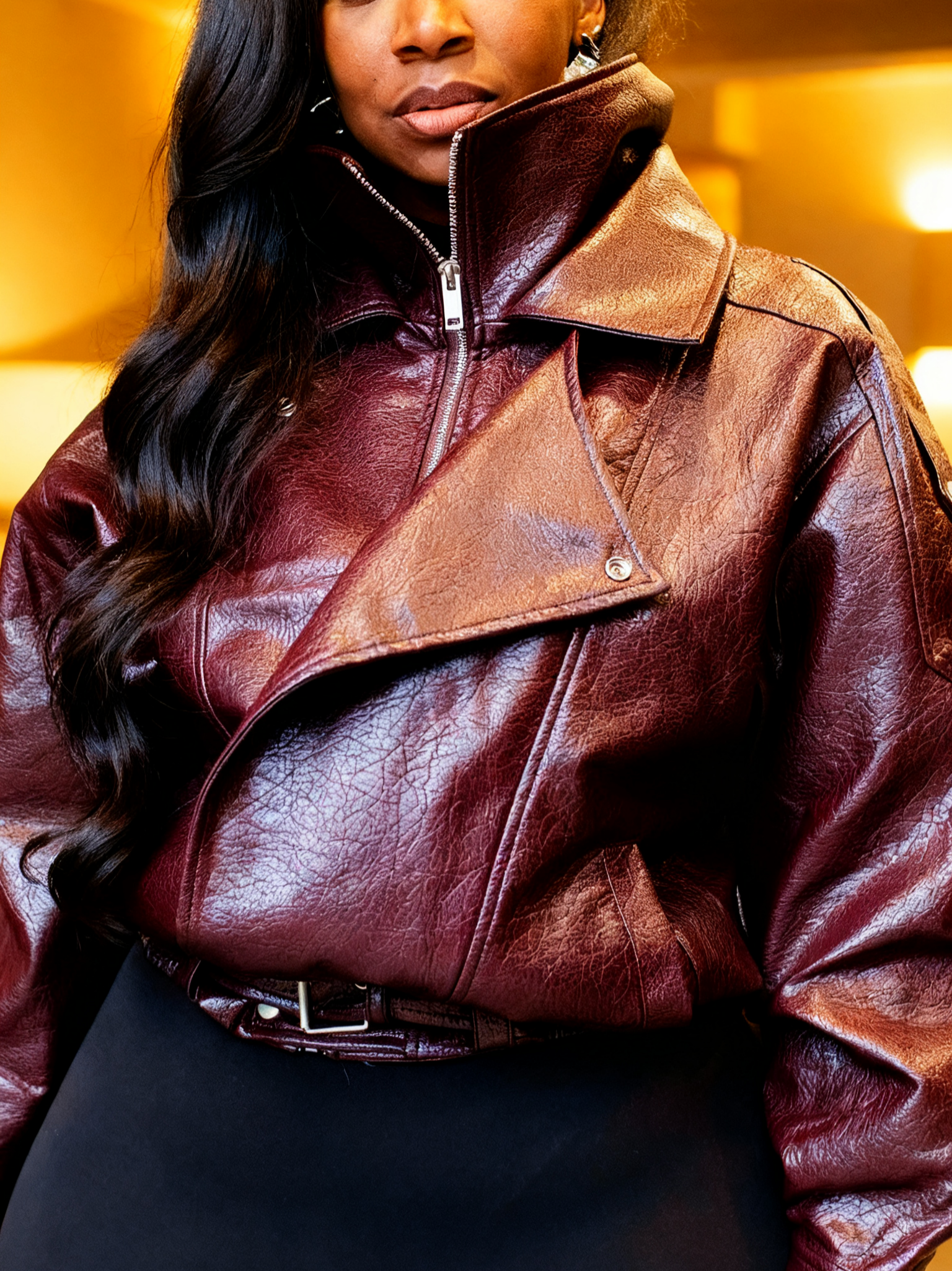 Oversized faux leather jacket. exceptionally made with the look of luxury minus the expense . Double collar and silver hardware.