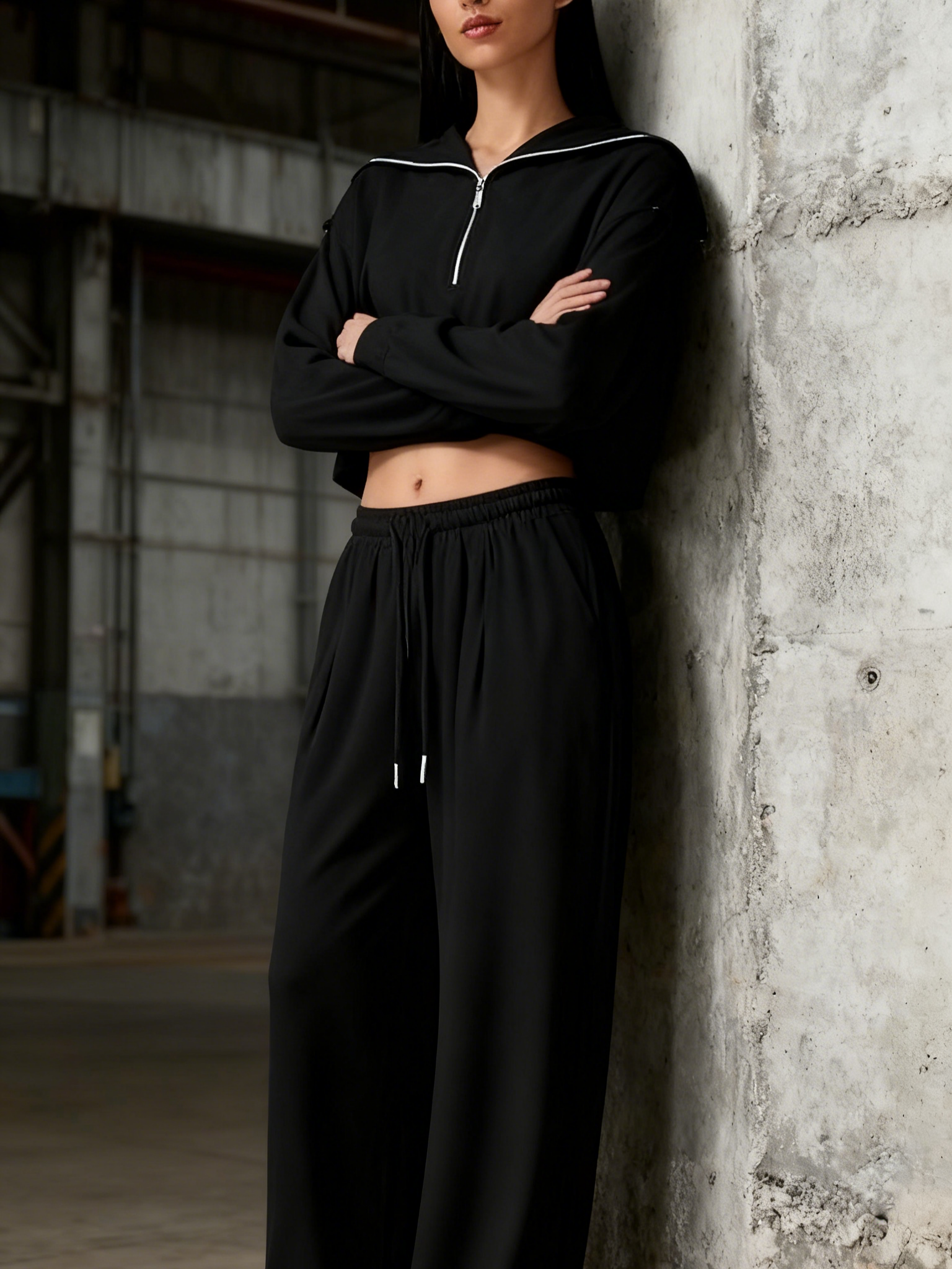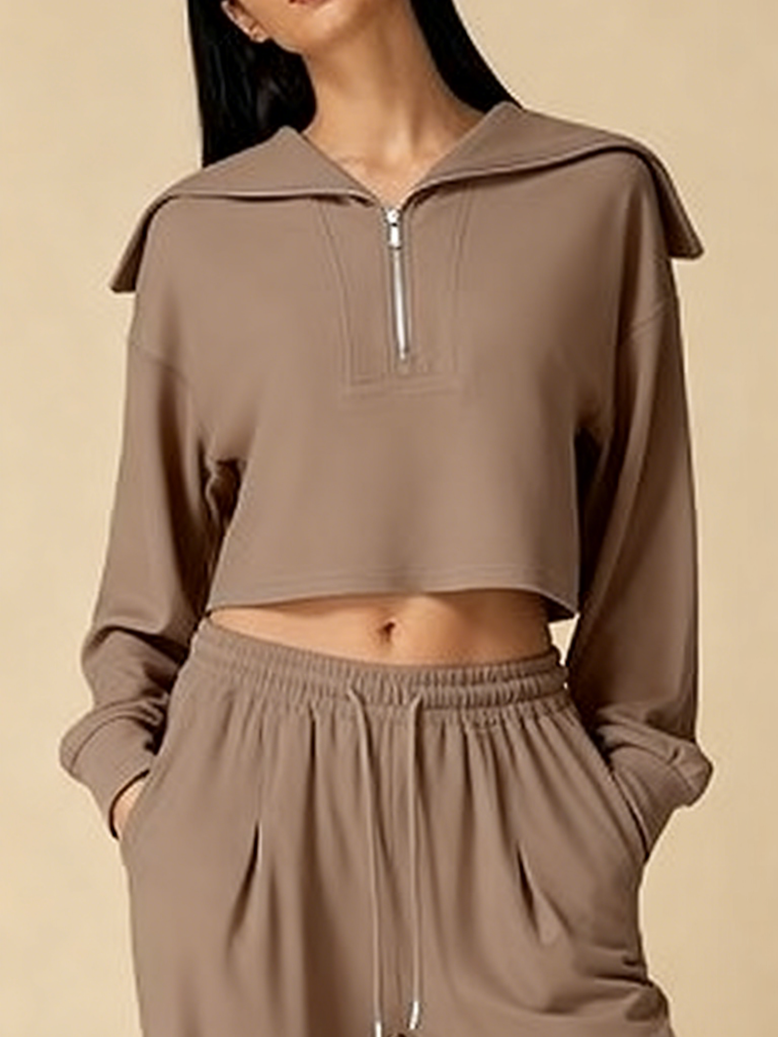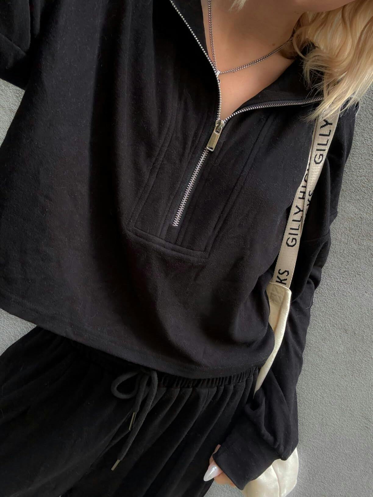 Featuring a relaxed silhouette with a trendy half-zip design, V neck, and wide collar, this lounge set combines both style and comfort, making it perfect for casual outings or lounging at home.