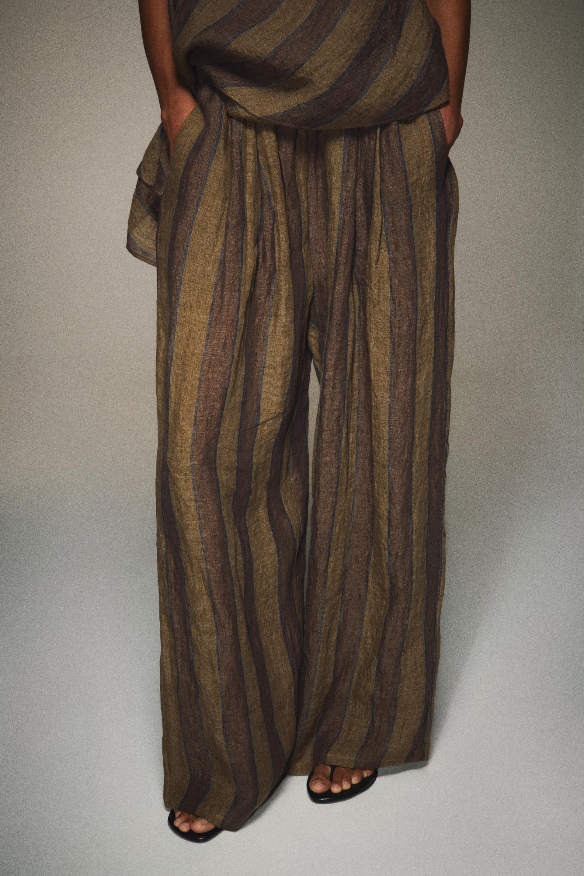 Earth Tone Striped Linen Halter & Wide-Leg Pants Two-Piece Set