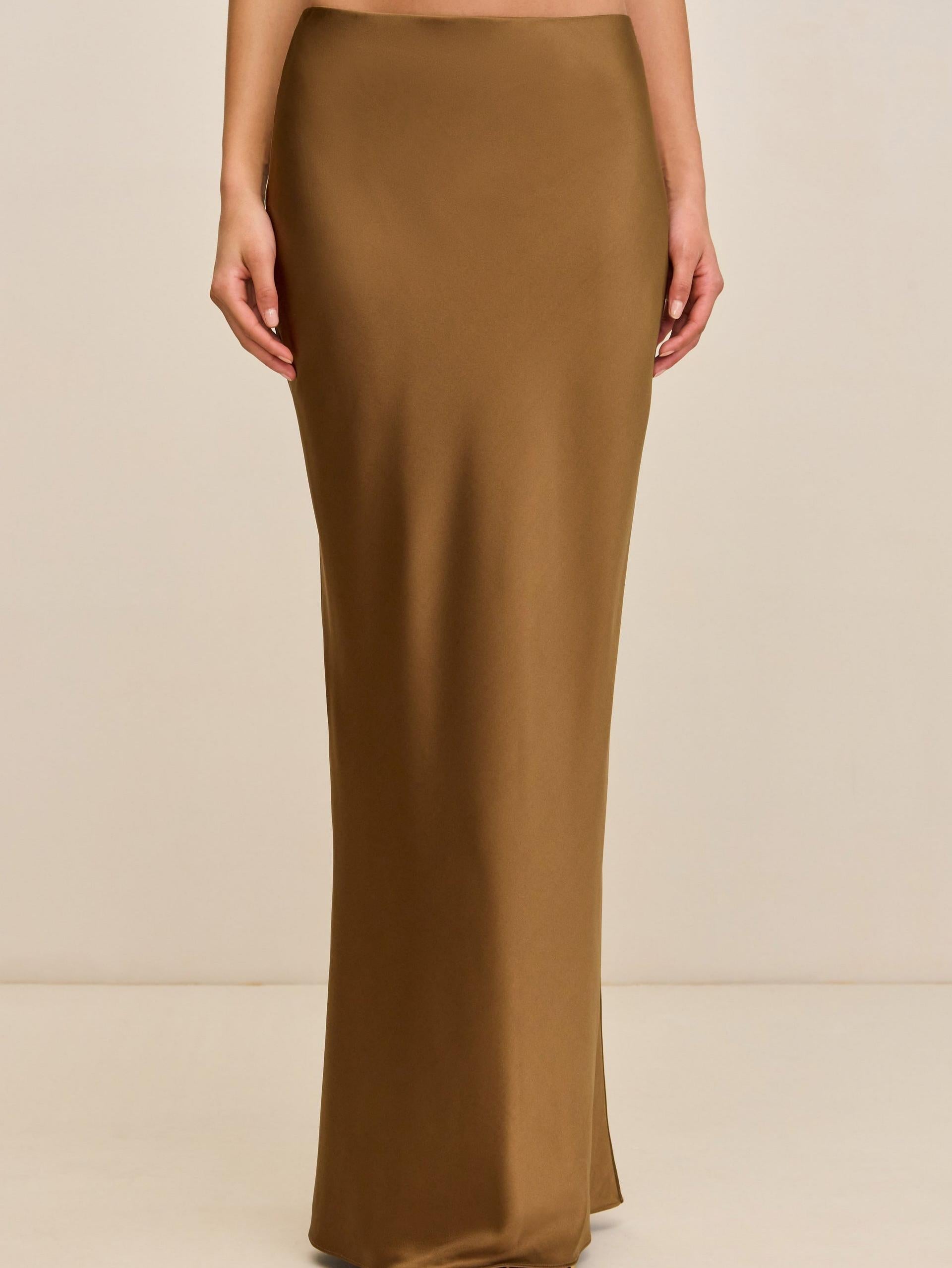 Elegant Bronze Ensemble: Sleeveless Fringe Top Paired with Flowing Satin Skirt
