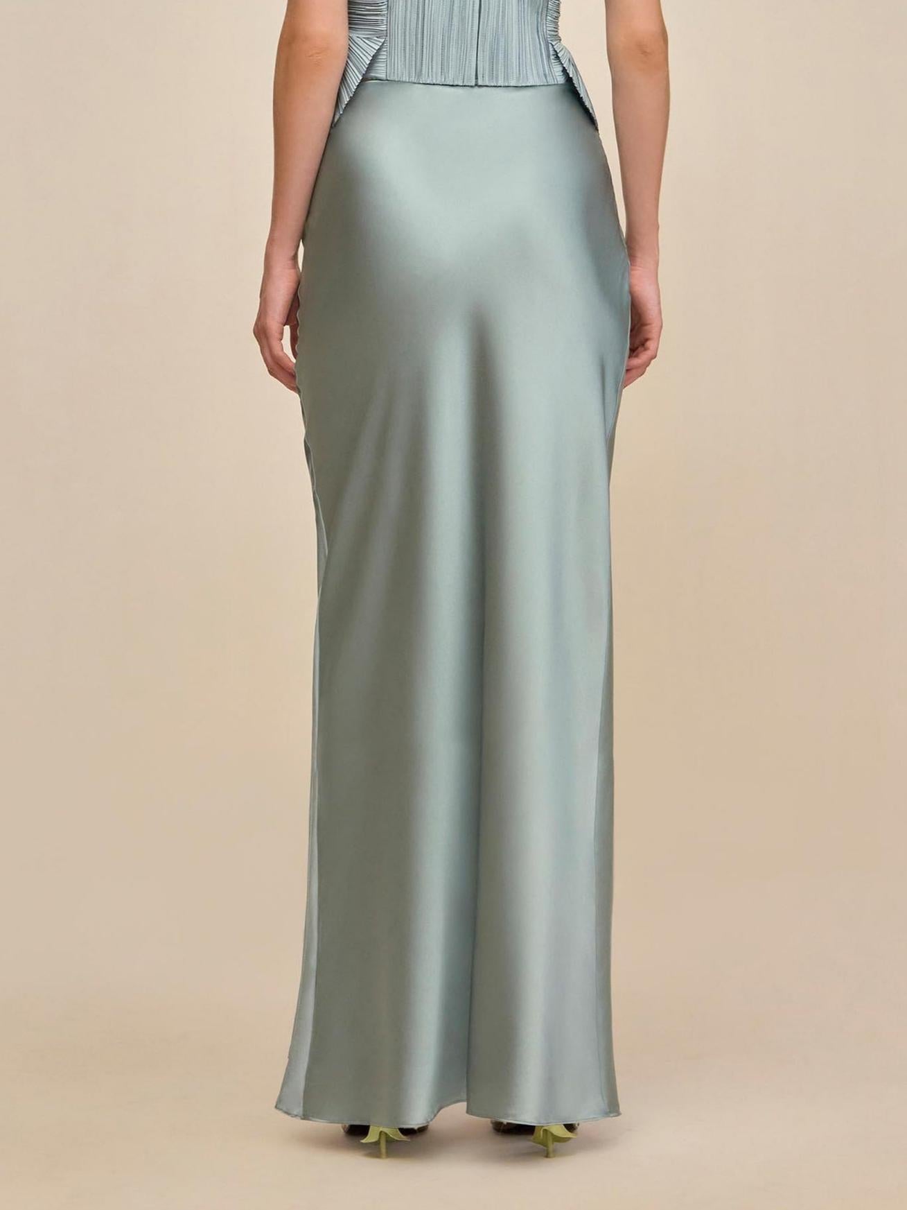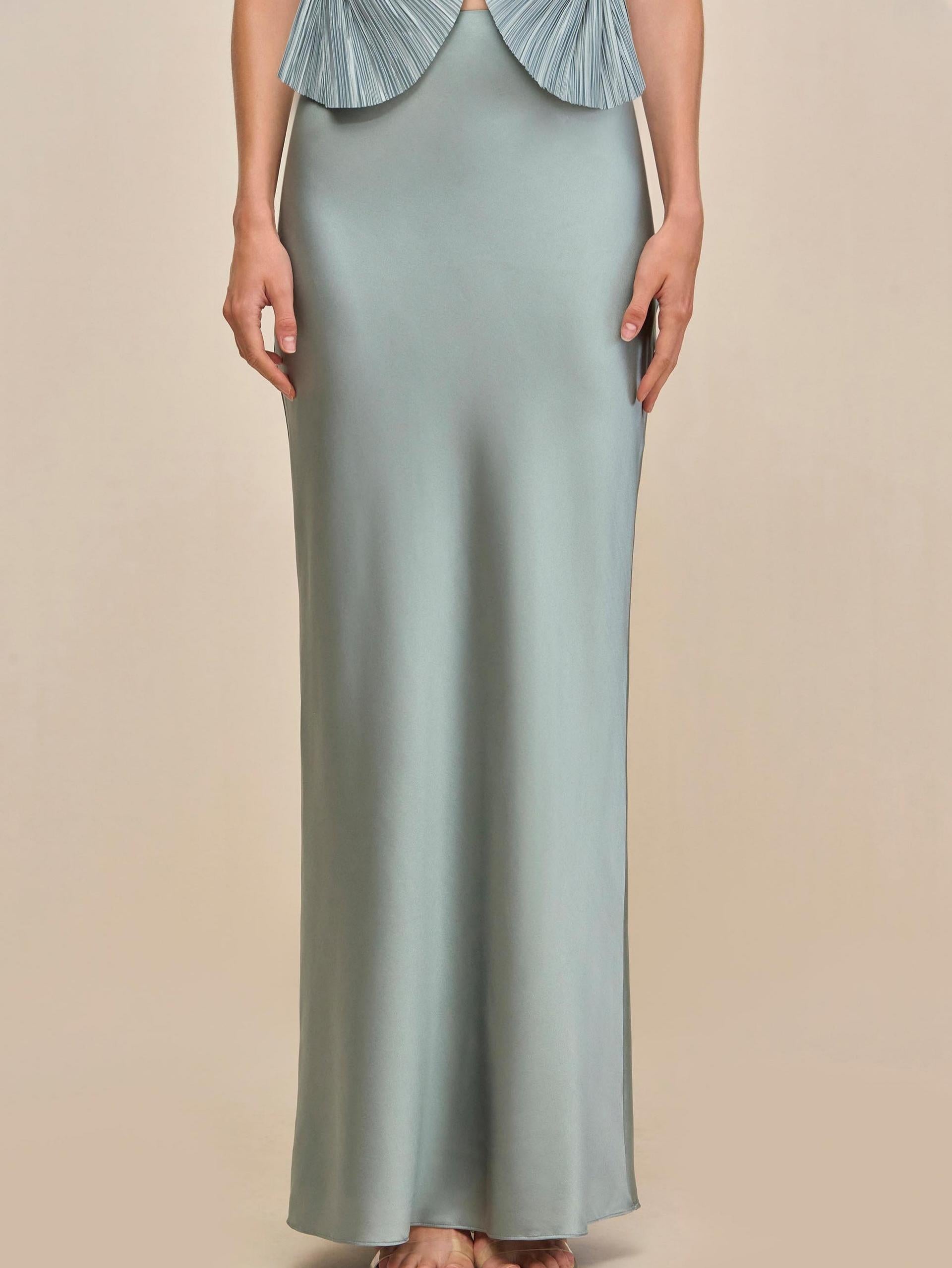 Elegant Celadon Ensemble: Sleeveless Fringe Top Paired with Flowing Satin Skirt