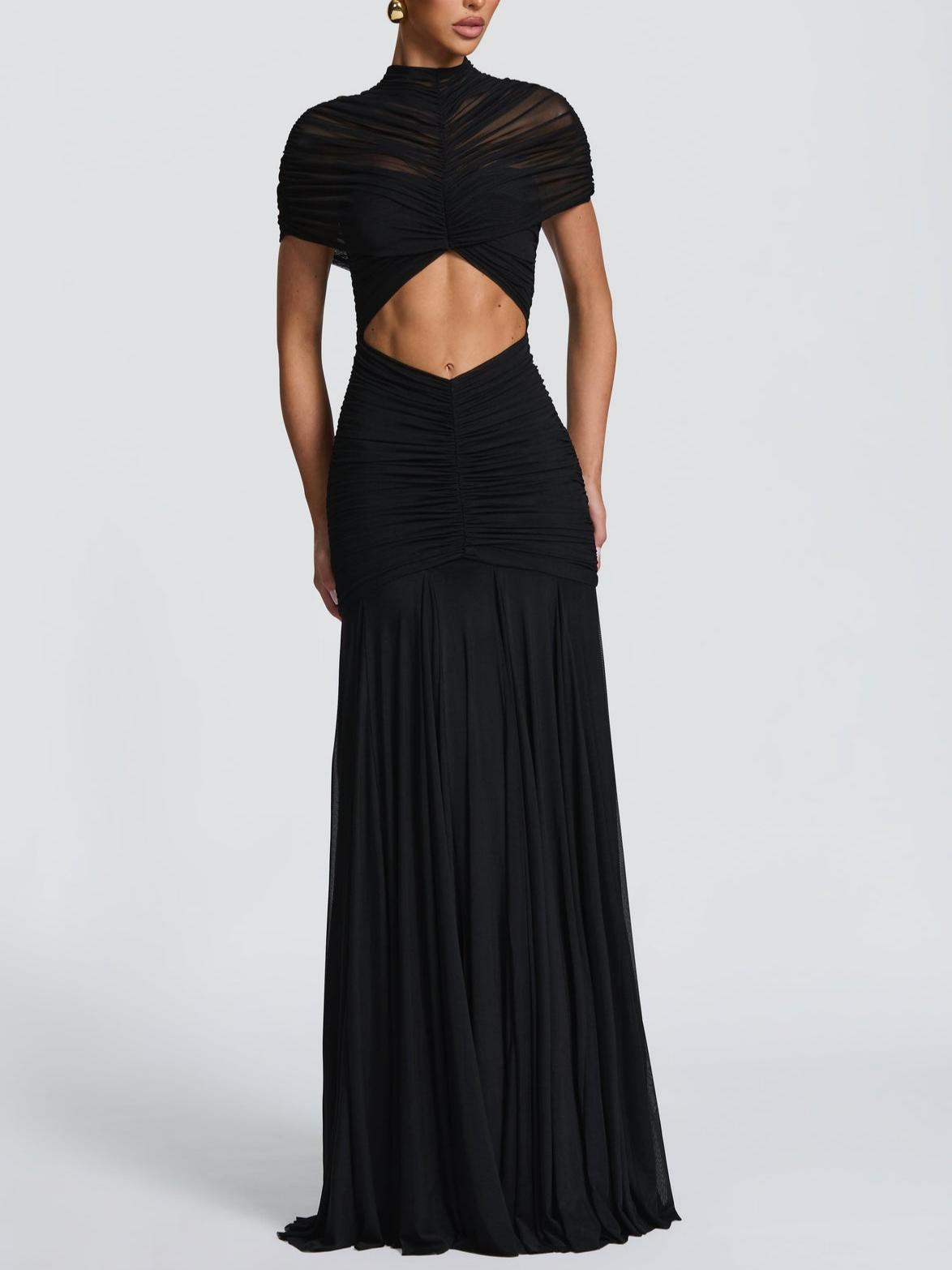 Elegant High Neck Ruched Mesh Gown in luxurious stretch mesh with jersey lining. Features a striking high neckline adorned with a tightly ruched sheer cape overlay, fitted bodice with a diamond-shaped cutout, and dramatic ruching through the bodice and hips. The flared maxi skirt flows with multiple godets for an elegant, dynamic silhouette.