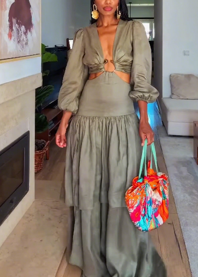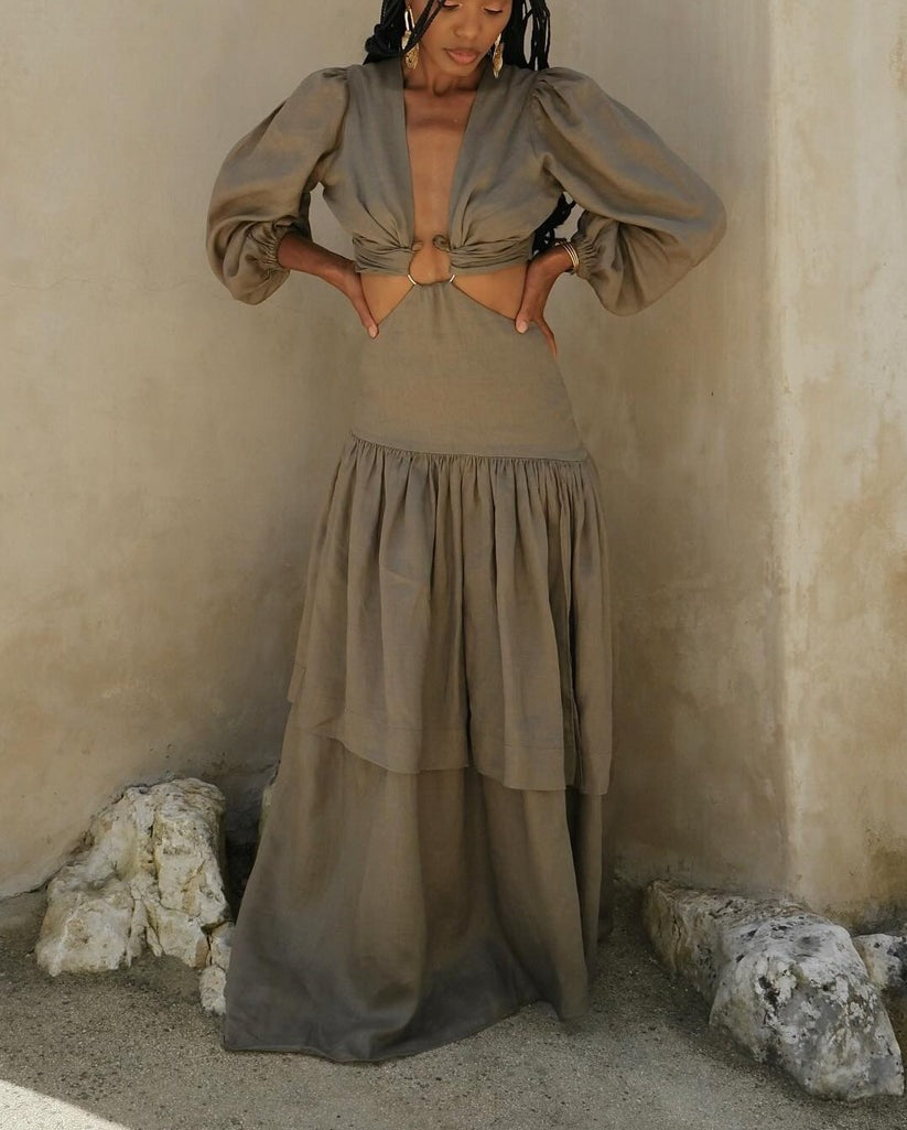 Elegant Maxi Dress with Cut - out Design and Puffed Sleeves