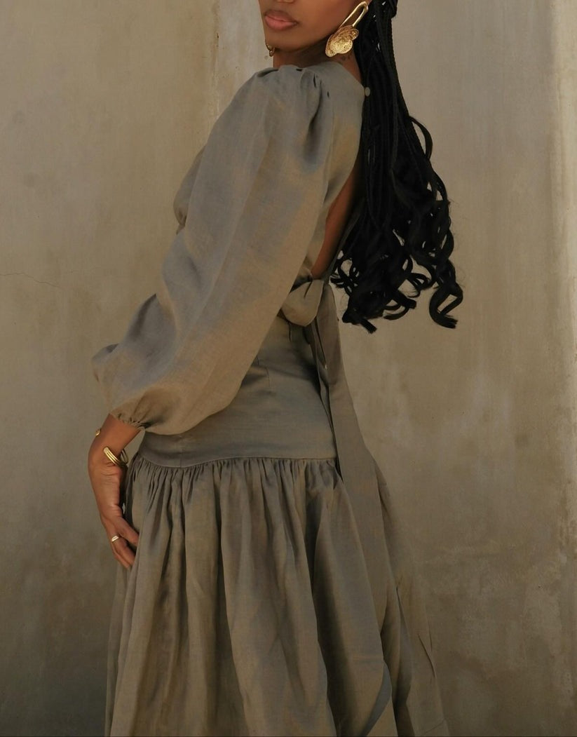 Draped in fluid, figure-skimming fabric, this showstopping maxi dress merges old-world drama with modern seduction. The deep back cut-out reveals just a whisper of skin, while the cinched waist tie accentuates your curves with effortless grace. Statement puffed sleeves add a touch of regal romance, balanced by the dress’s sleek, elongating silhouette.