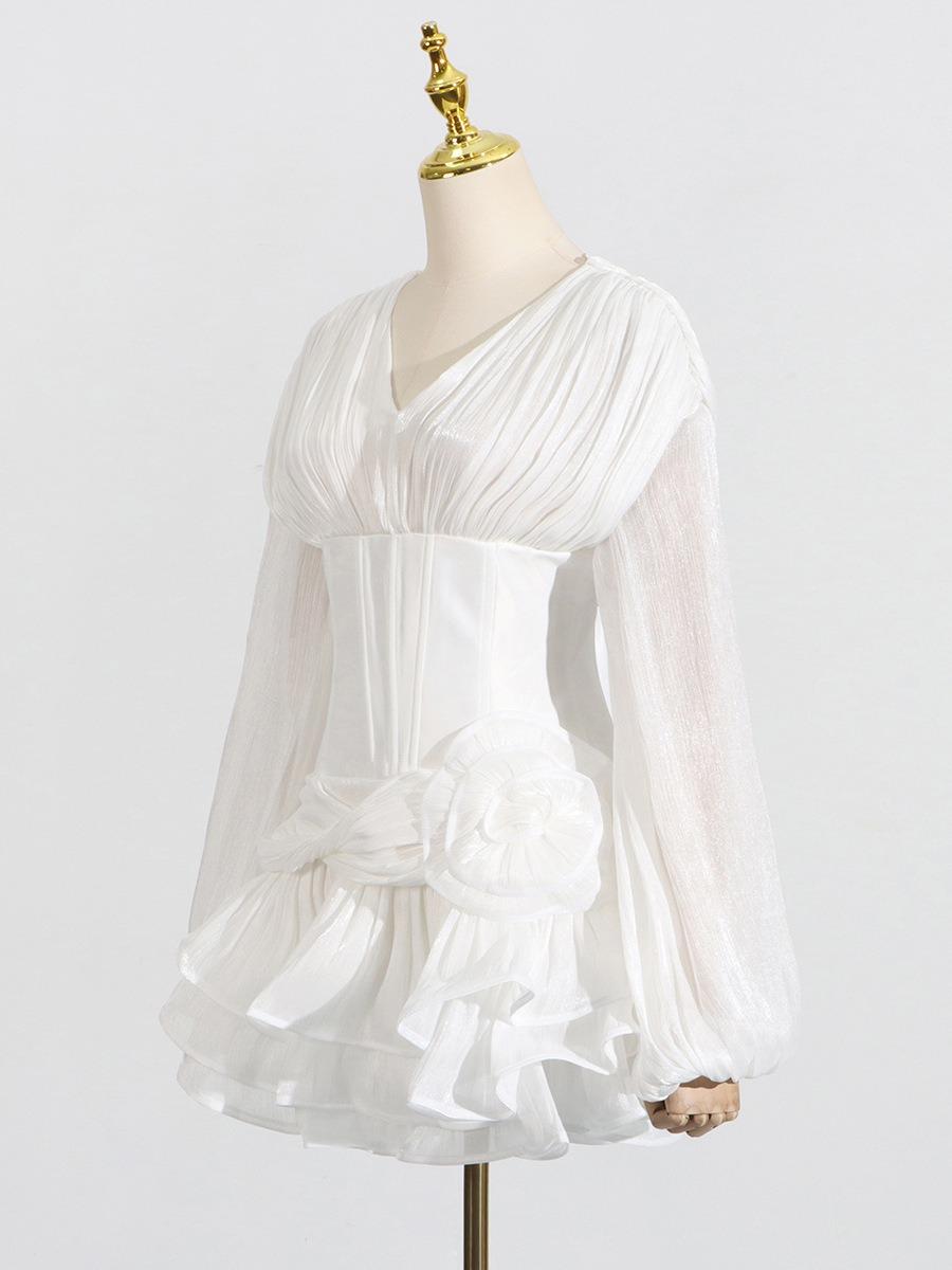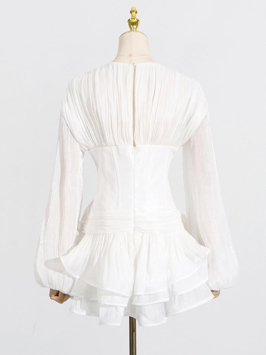 Elegant Puff Sleeves and Ruffle Details White Dress