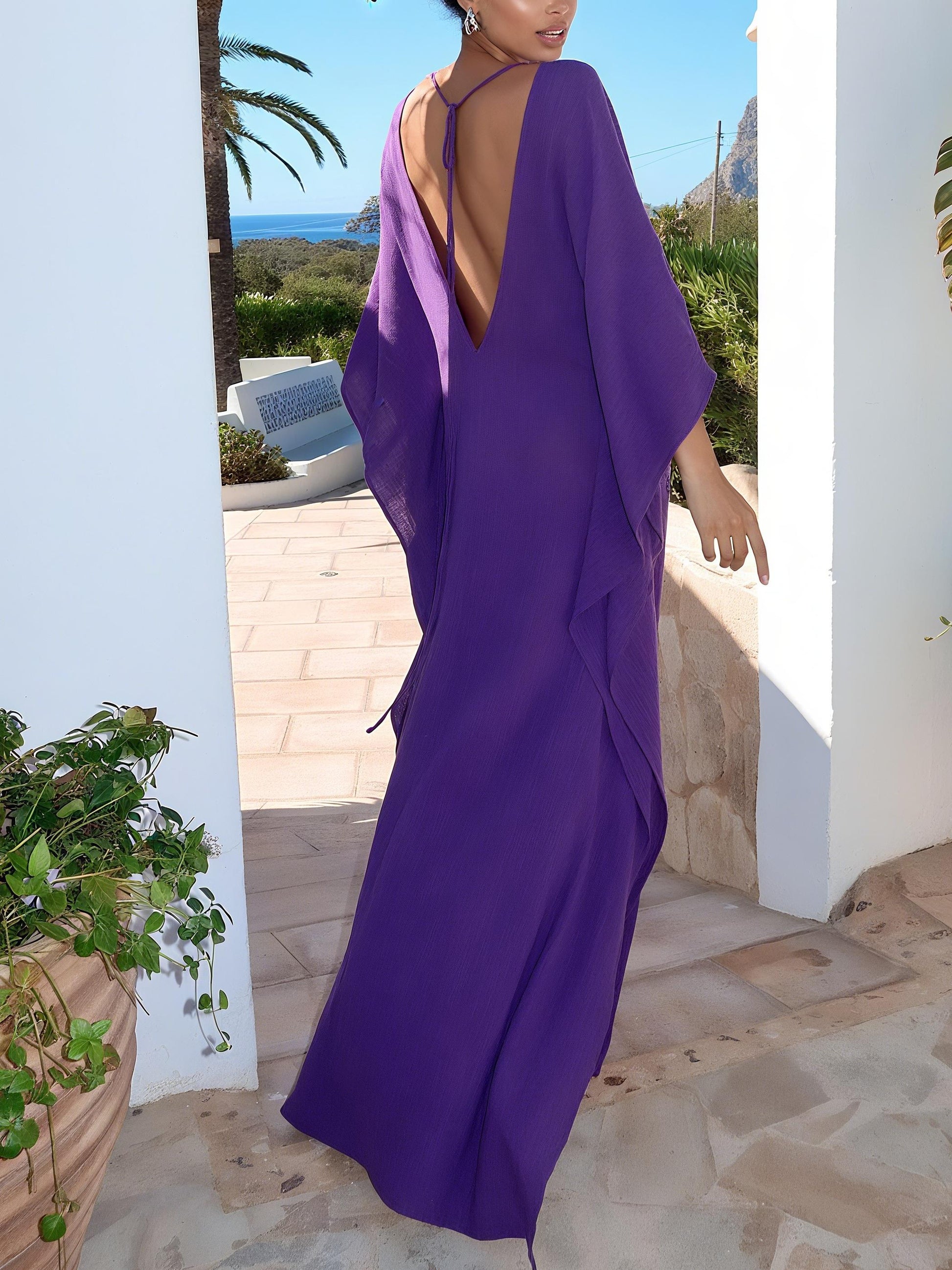 Long purple dress in a lightweight, flowing fabric with a plunging neckline and an open back with thin ties. The wide, kaftan-style sleeves and front slit add sophistication and movement. Ideal for elegant summer looks, sunset dinners, or as a refined beach cover-up in tropical destinations.