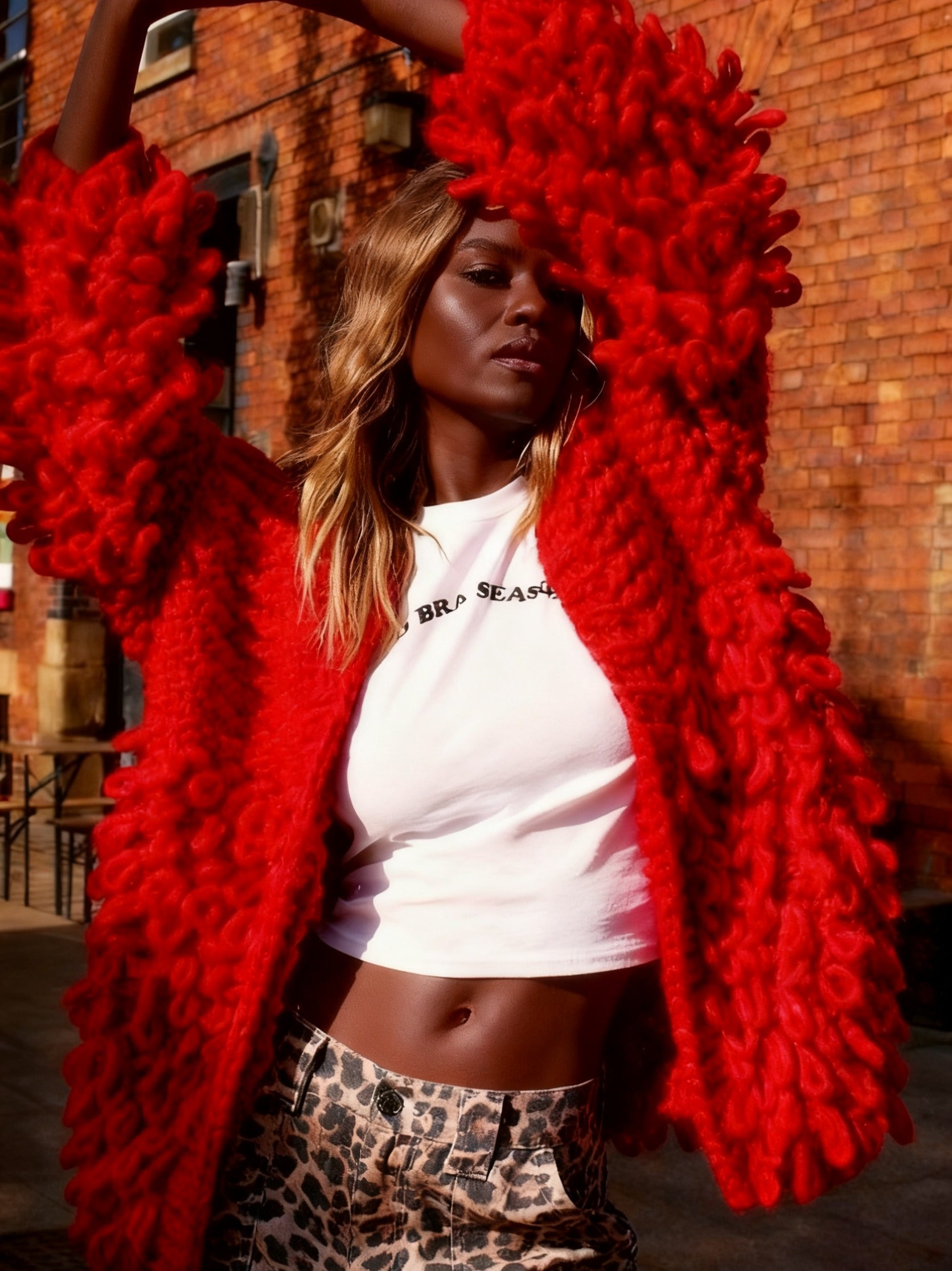 Make a bold statement with this Extreme Loopy Cardigan. This eye-catching piece is all about texture, featuring an oversized silhouette adorned with dramatic, loopy knit detailing. Perfect for those who dare to stand out, this cardigan effortlessly adds depth and interest to any casual ensemble. Style it over a simple crop top and high-waisted shorts for a chic contrast, or throw it on over a fitted dress to create a captivating juxtaposition. The open front design allows for easy styling, making it ideal for layering during transitional seasons.