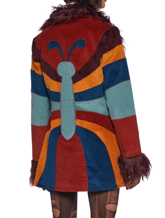 This coat comes in a corduroy construction, with faux fur trim, a striped pattern with a butterfly detail at back, and engraved button up closures.