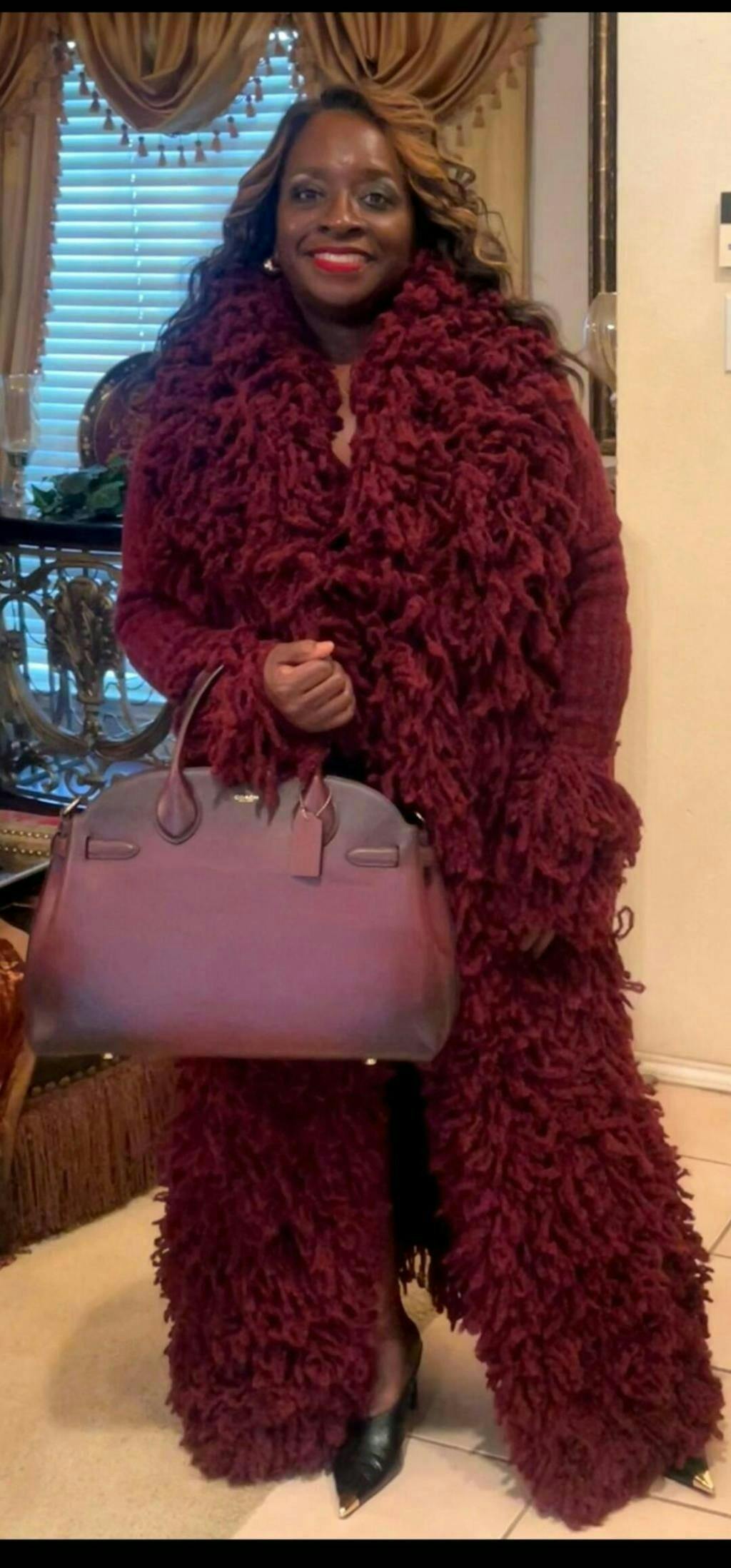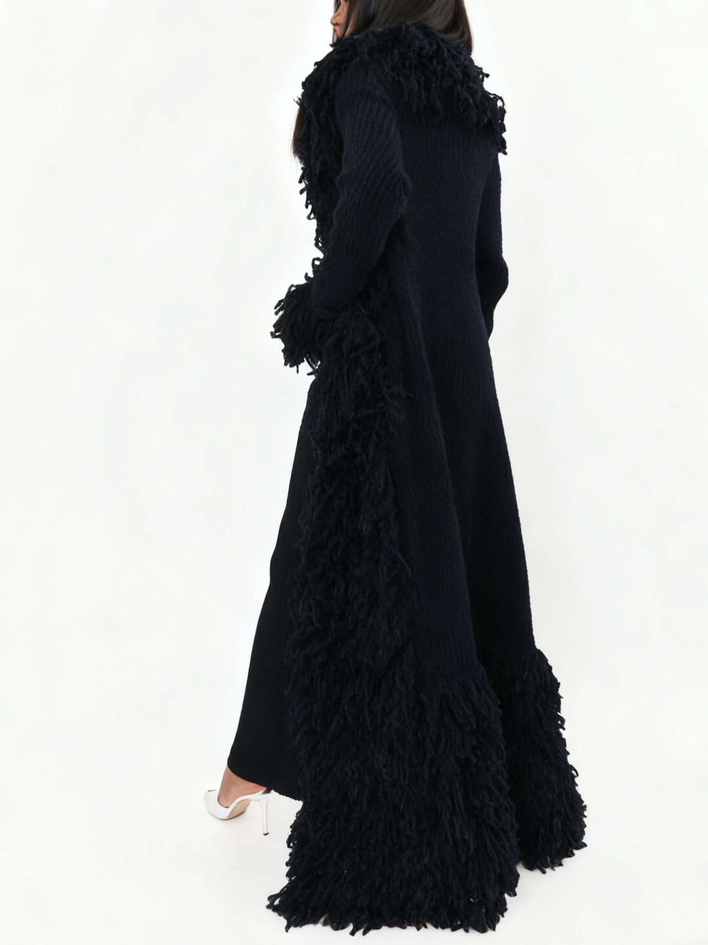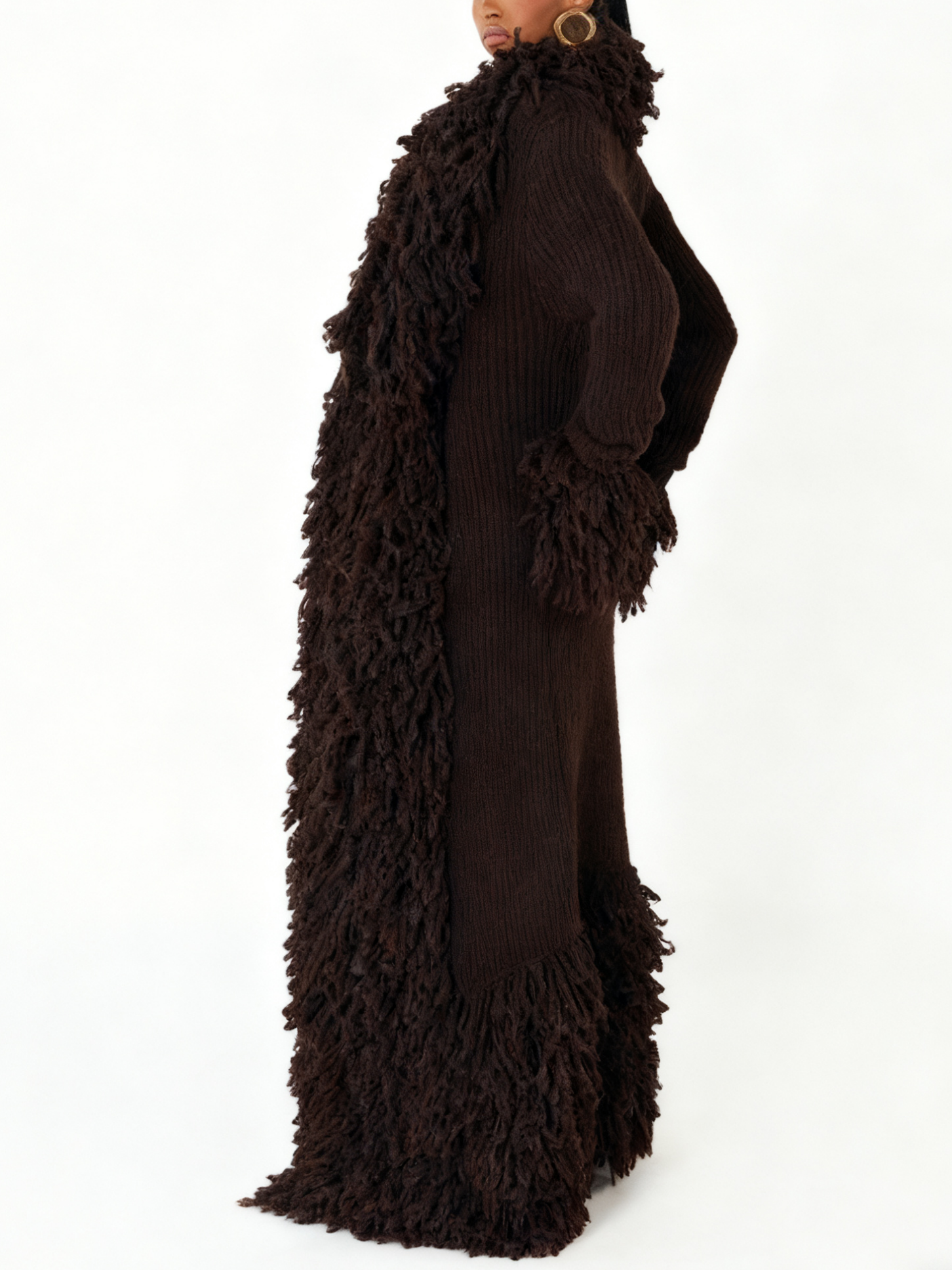 Our knitted coat is stunning! She's made of super soft lofty yarn in a gorgeous chocolate, olive or classic black that's accentuated by full fringes down the front, giving texture and complexity.