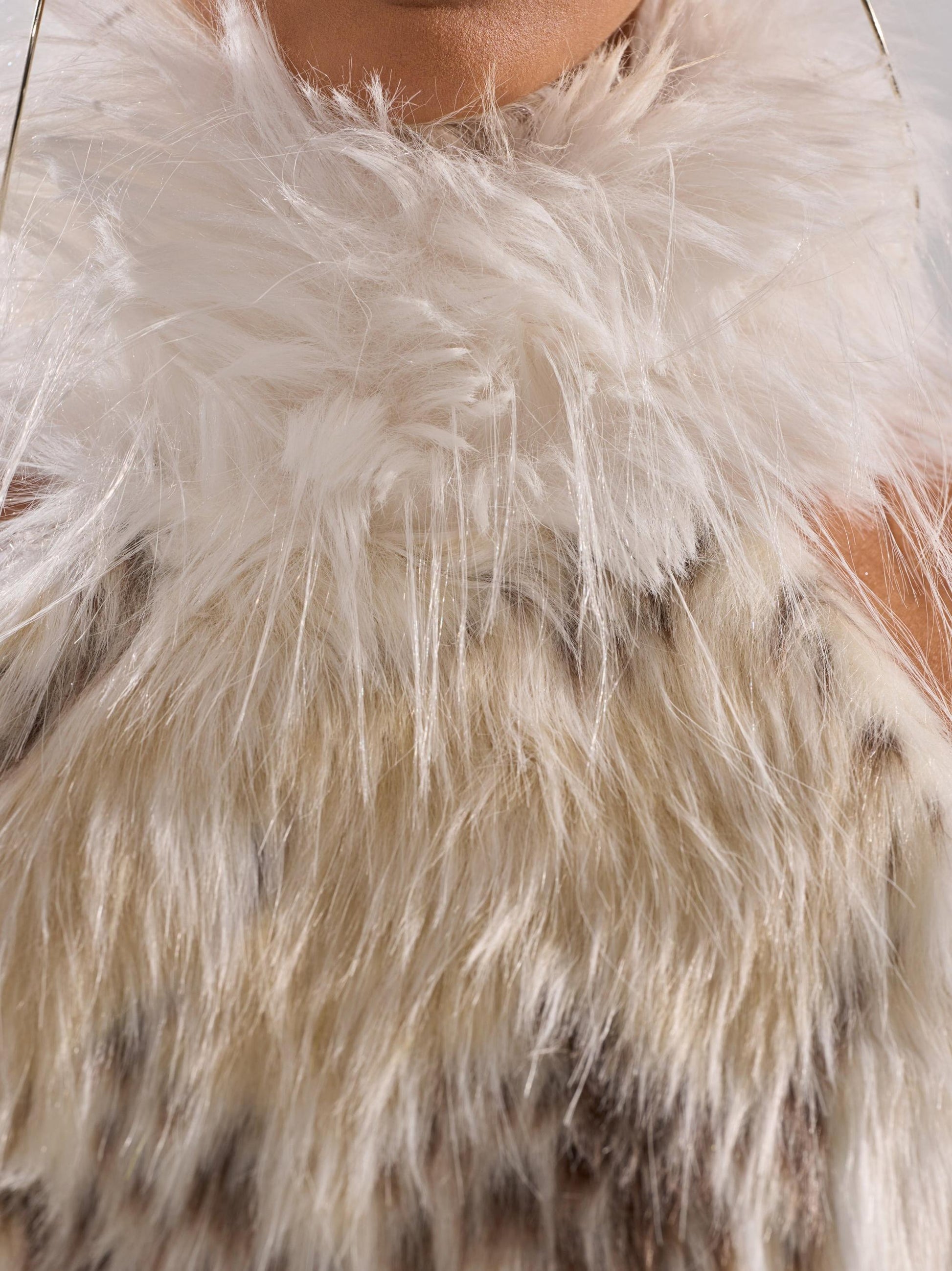 The Faux Fur Pants Set feature a plush faux fur design with a soft cream and brown pattern for a bold, textured finish.
