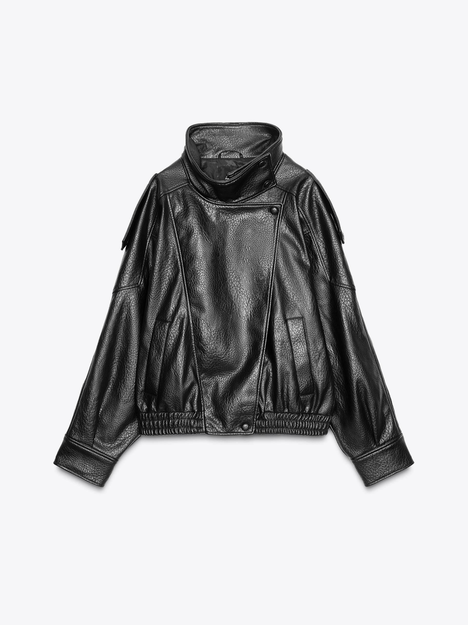 Jacket with a stand-up collar and long sleeves with tab detail on the shoulders. Side pockets. Contrasting lining. Zip-up fastening with a snap-button placket on the front.