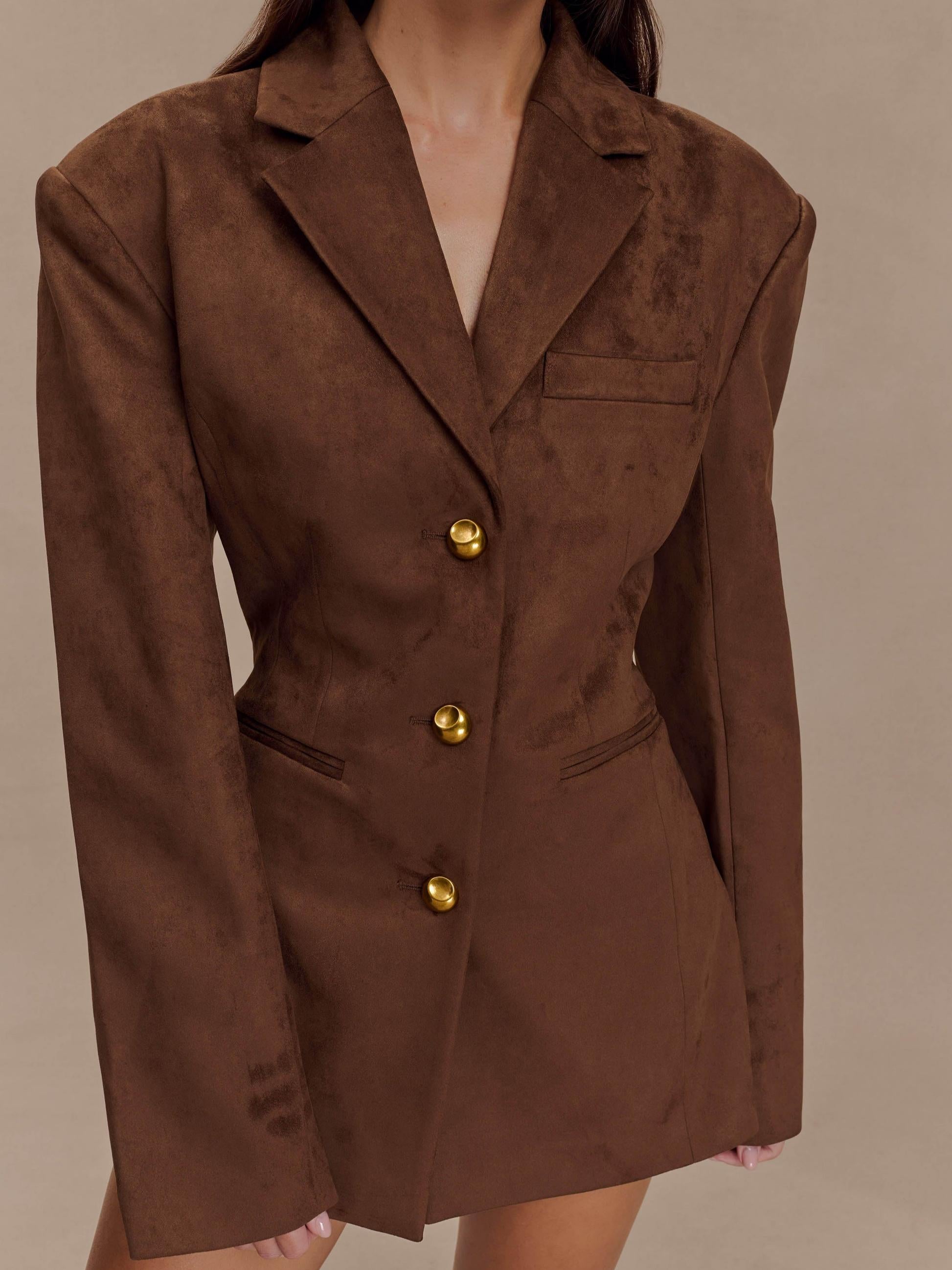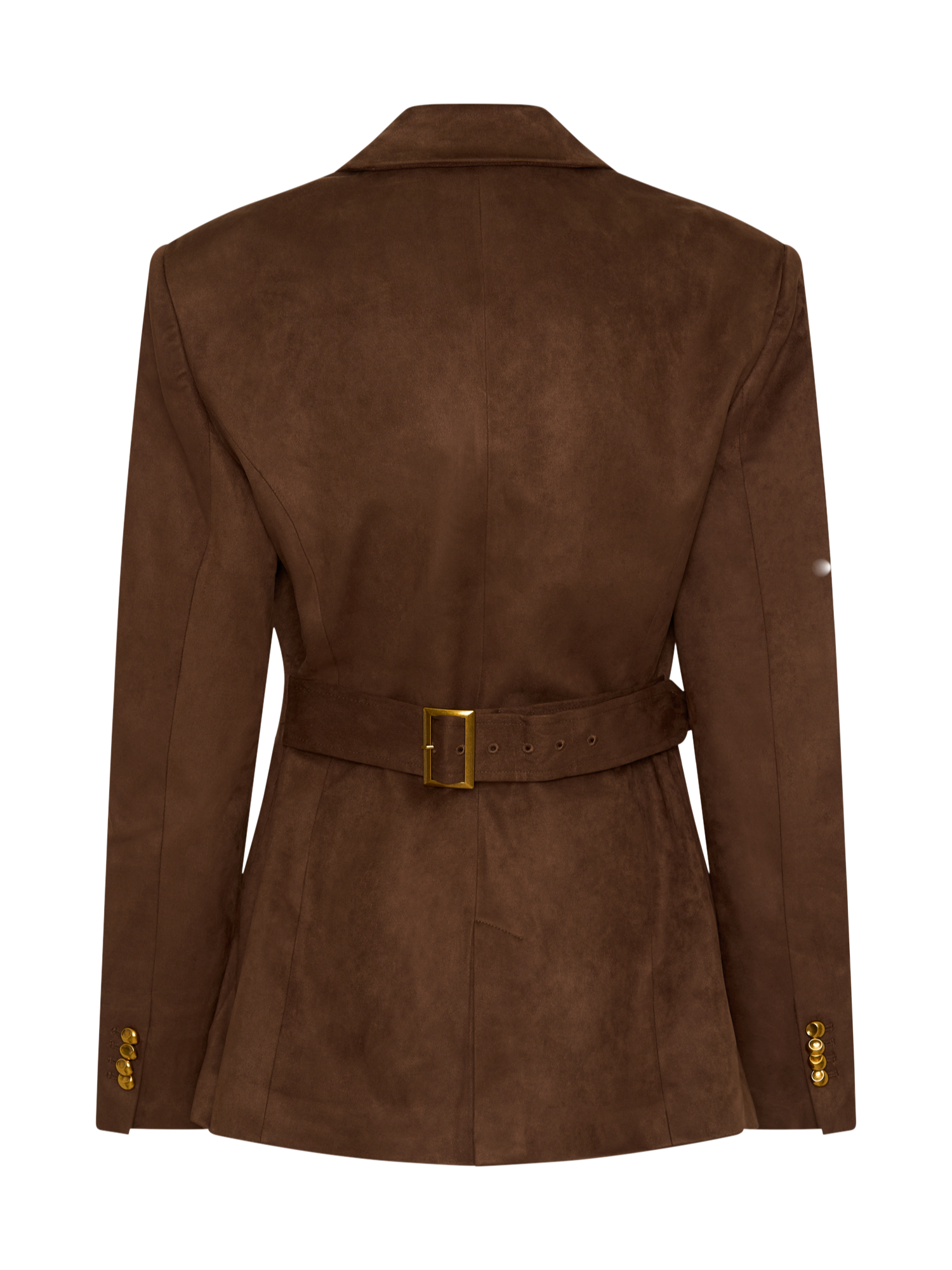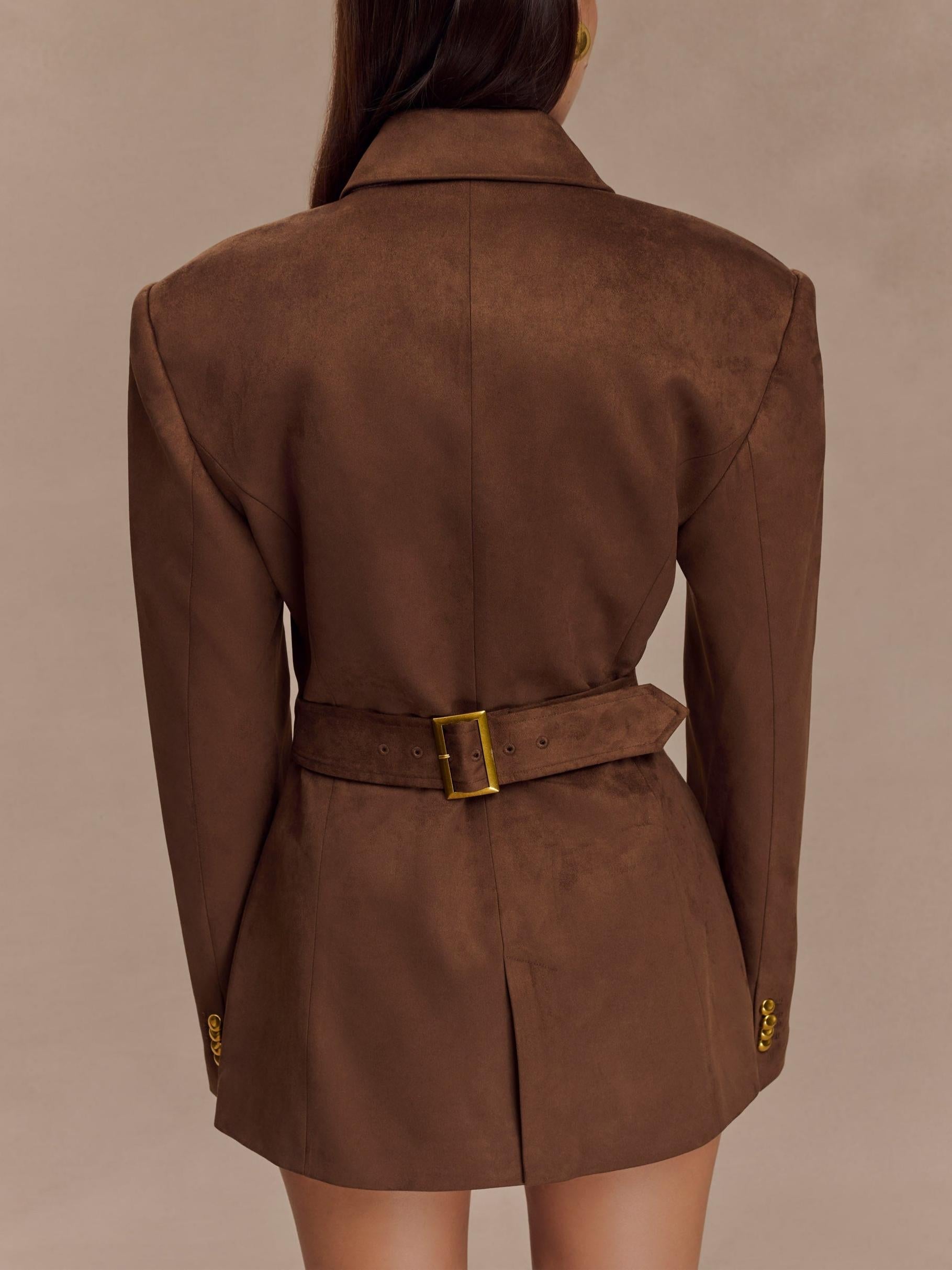 Less effort, more impact. The Faux Suede Cinched Blazer is the ultimate blend of structure and softness. Featuring a classic notched lapel, internal shoulder pads, and front button fastening, this blazer is elevated by a cinched waist and back belt detail that sculpts the silhouette. Functional breast and welt pockets add a touch of polish, while the full lining ensures a comfortable fit.