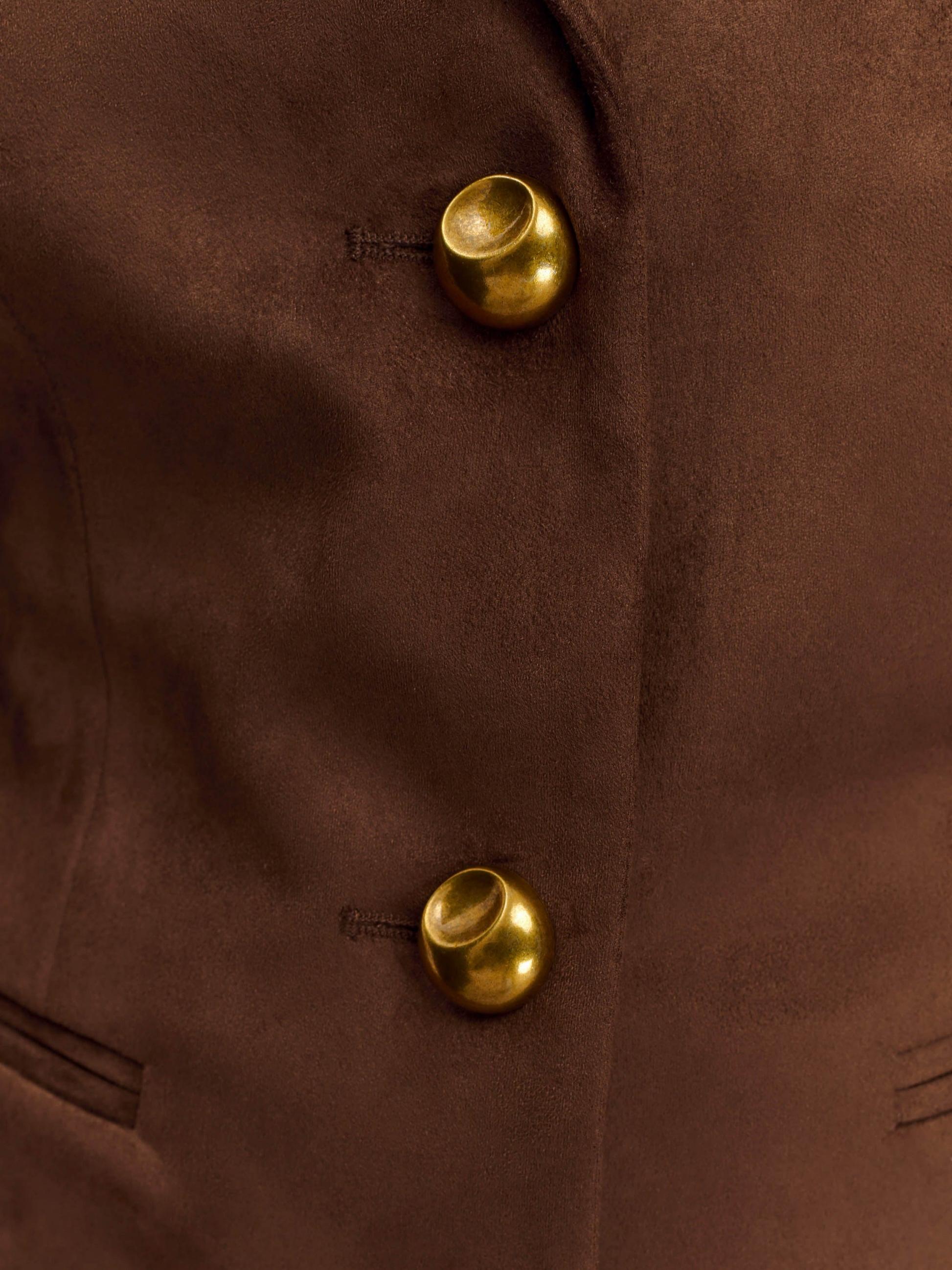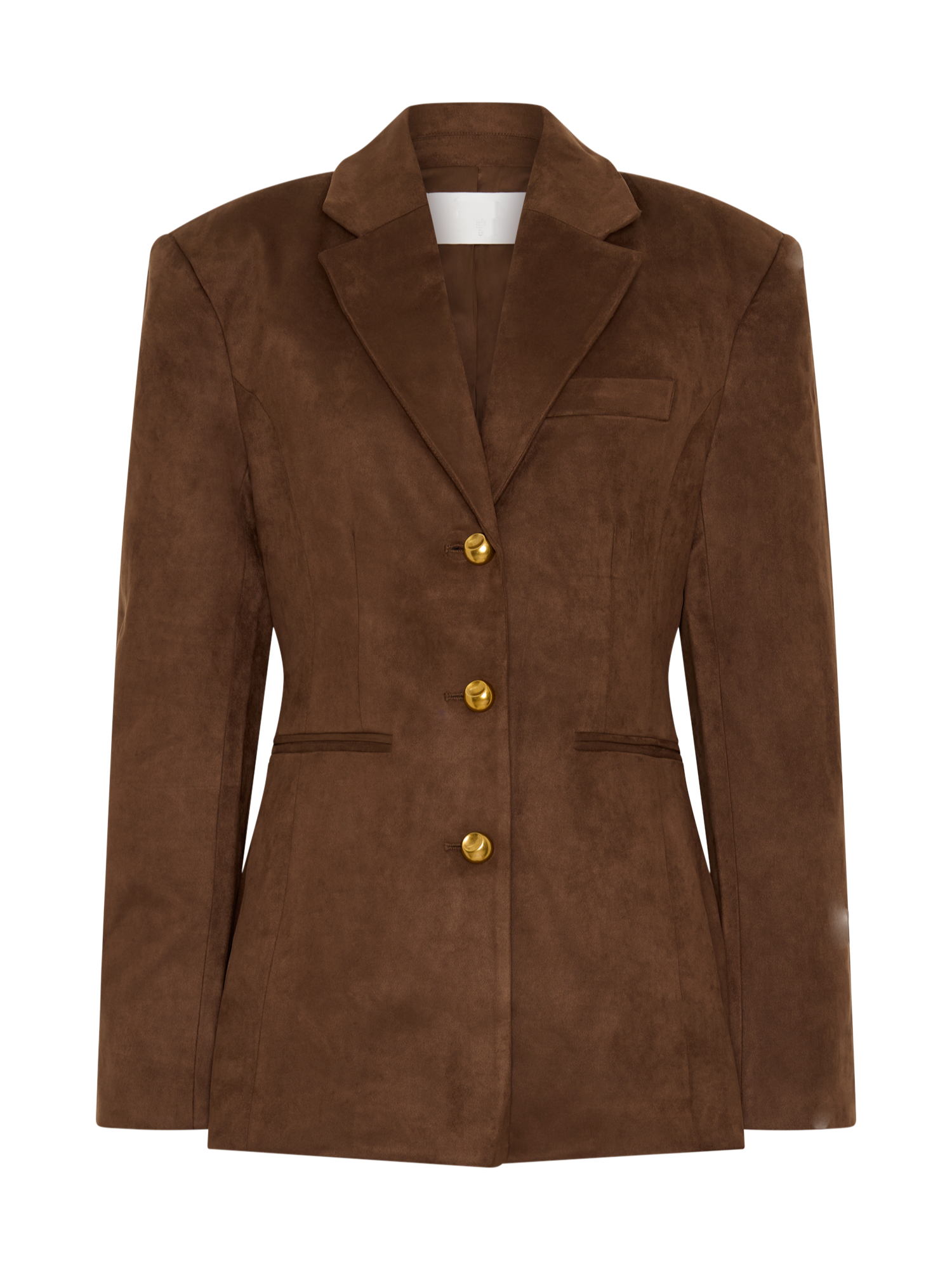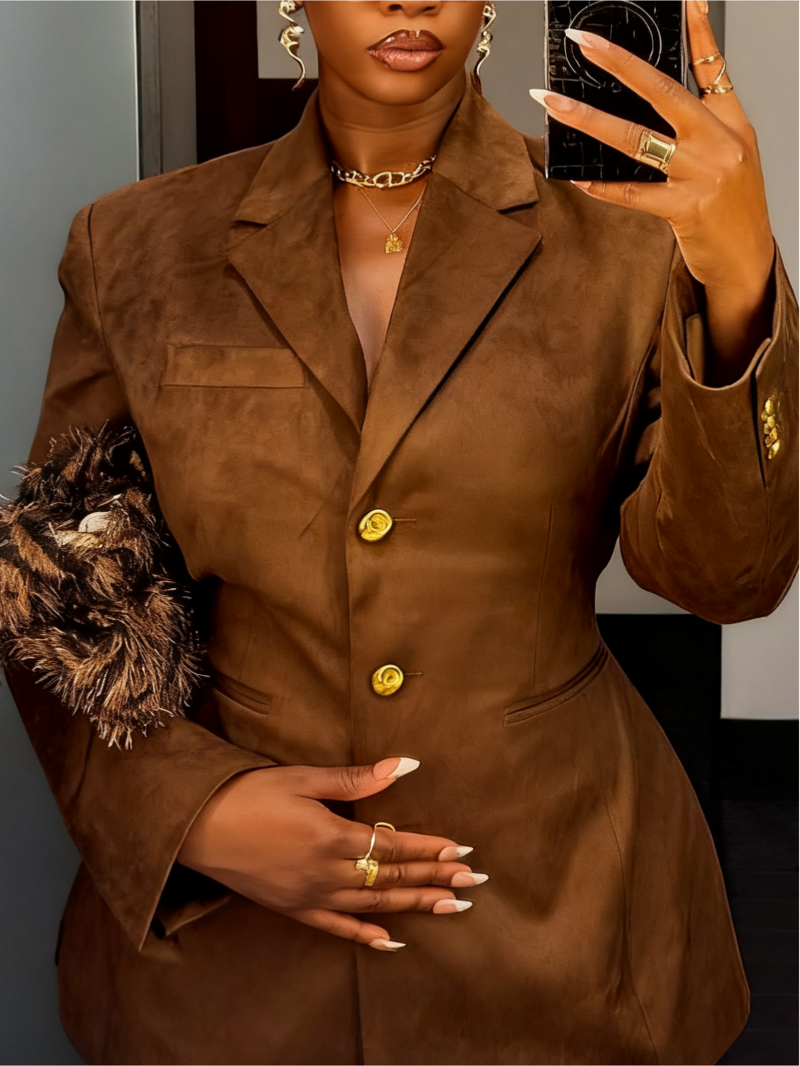 Less effort, more impact. The Faux Suede Cinched Blazer is the ultimate blend of structure and softness. Featuring a classic notched lapel, internal shoulder pads, and front button fastening, this blazer is elevated by a cinched waist and back belt detail that sculpts the silhouette. Functional breast and welt pockets add a touch of polish, while the full lining ensures a comfortable fit.