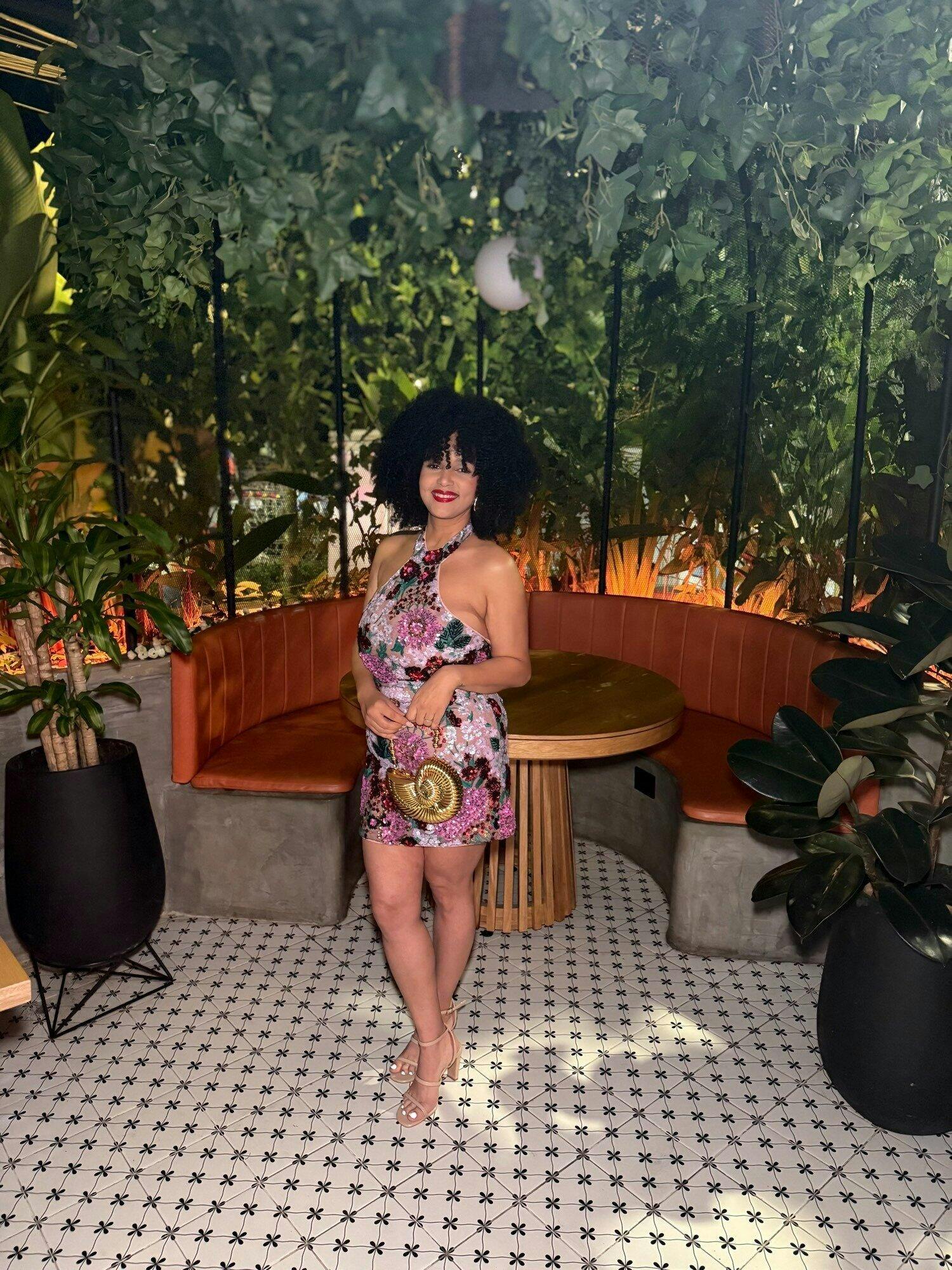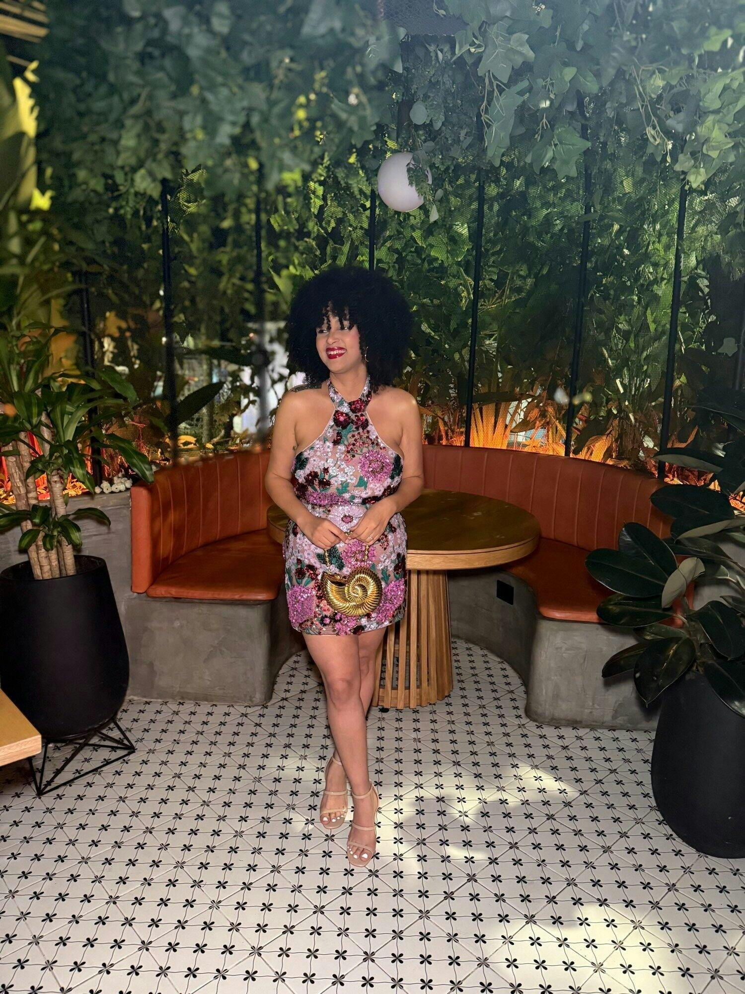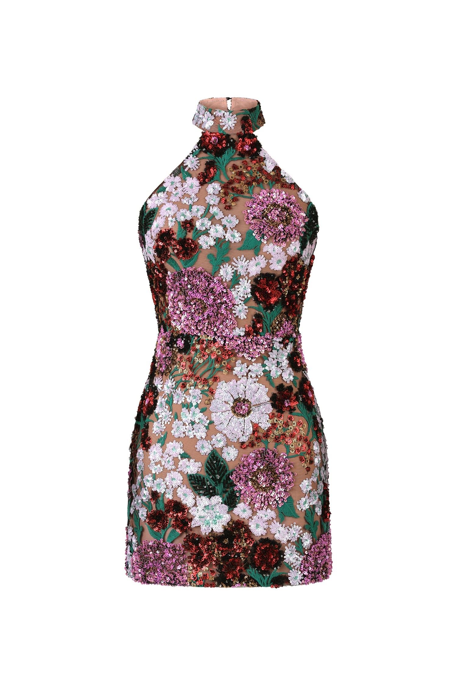 Crafted from sheer nude mesh, this dress is adorned with intricate hand-embroidered floral motifs in vibrant shades of purple, red, and ivory, layered over shimmering sequins that catch the light with every movement. The halter neckline ties at the back for a secure, customizable fit, while the curve-hugging mini silhouette accentuates your figure.