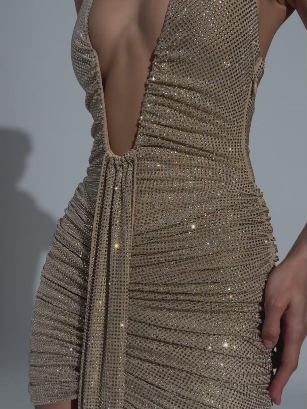 Gold Sparking Rhinestone Halter Deep V Ruched Mini Dress