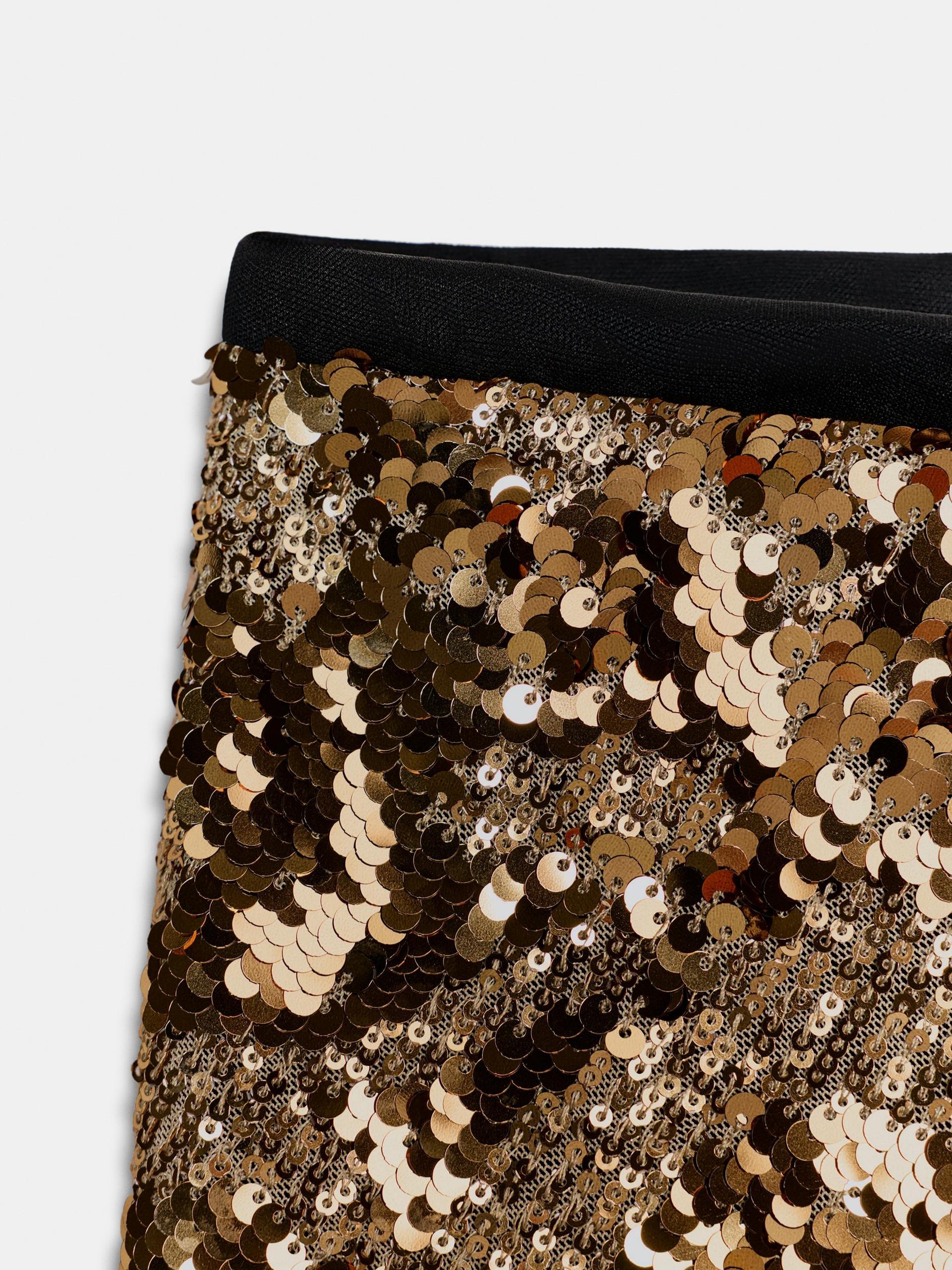 Halter neck top with V-neckline and open back. Interior lining. Asymmetric hem. Sequin skirt with an elastic waistband and inner lining.