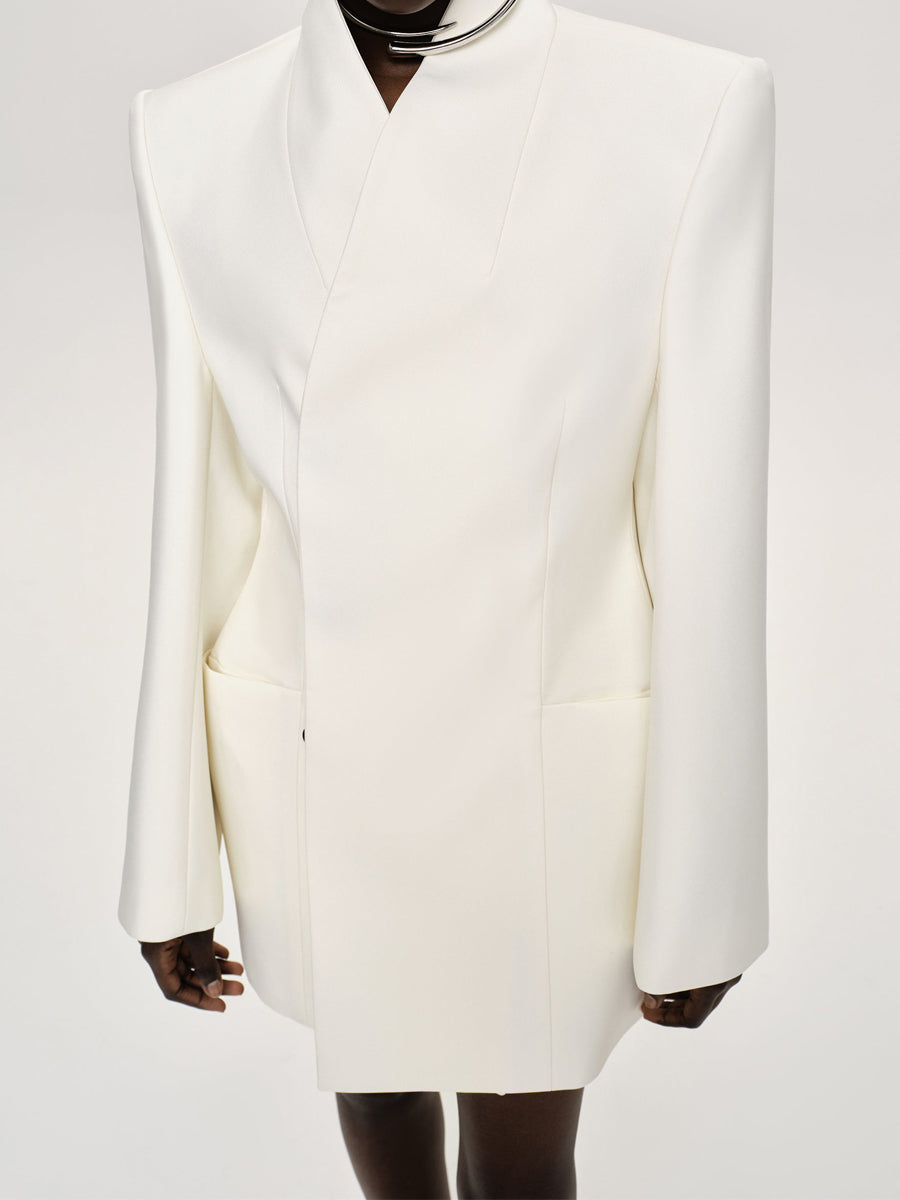 Crafted from midweight suiting fabric, featuring a cinched hourglass silhouette that falls below the hip. Structured fit strengthened by decisive lines, showcasing a tailored stand-collar and a lapelless design with a concealed button closure. Fully lined.