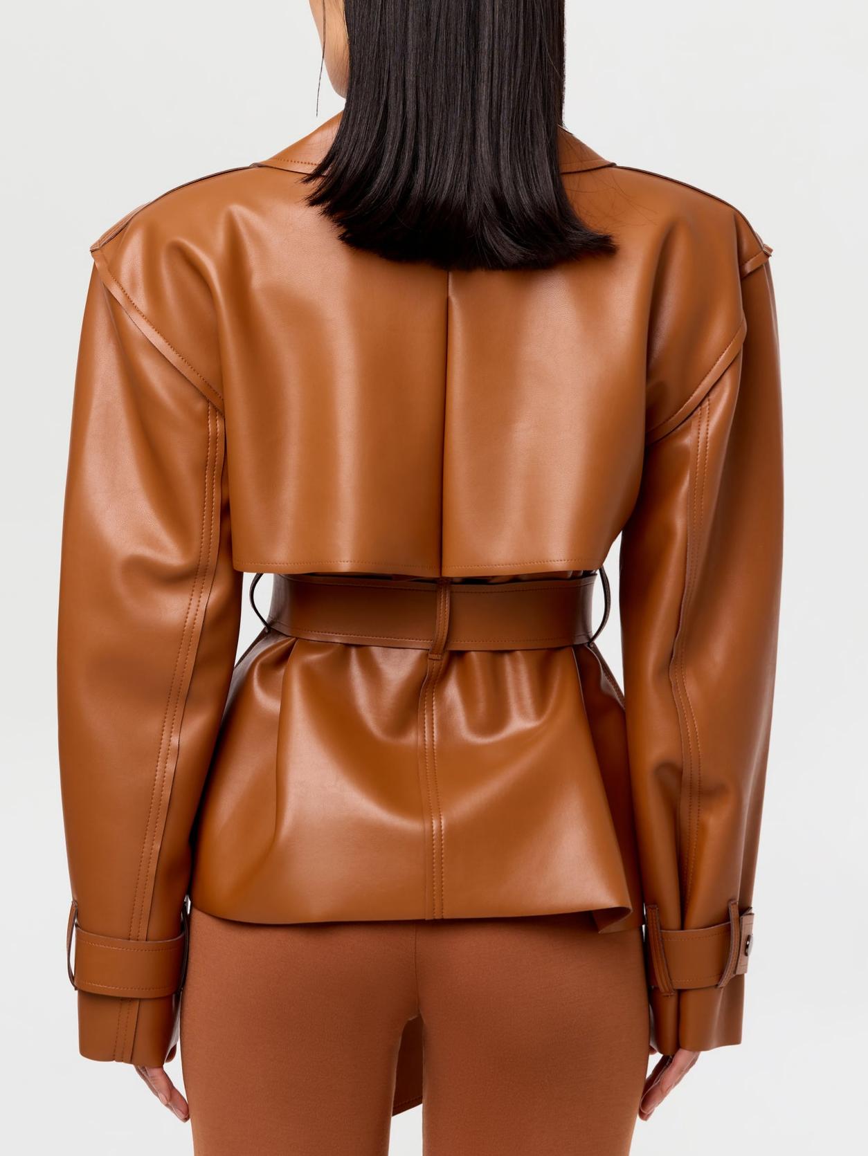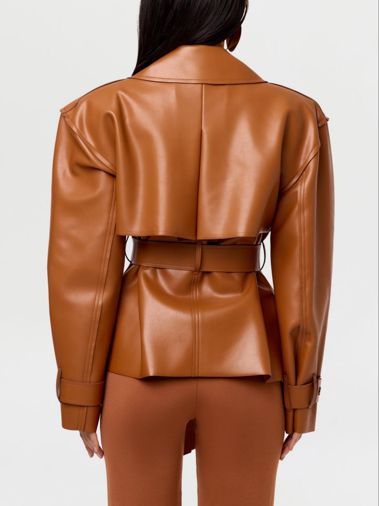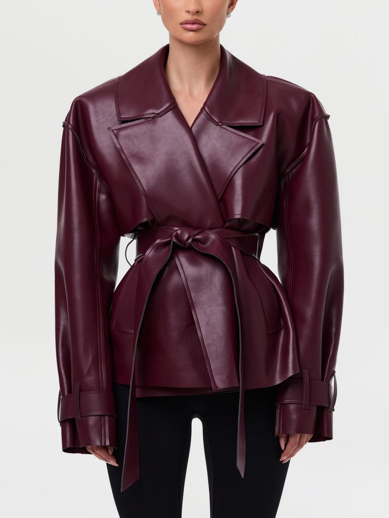 This leather oversized trench jacket is the perfect transition for the seasons. Designed with a luxurious smooth and buttery feel, notched collar and lapel, power shoulders, belted tie closure at the waist and back storm flap detail. Raw edge trim and adjustable hardware at the cuffs with loops complete the look. This is the perfect wardrobe staple to wear on rotation.