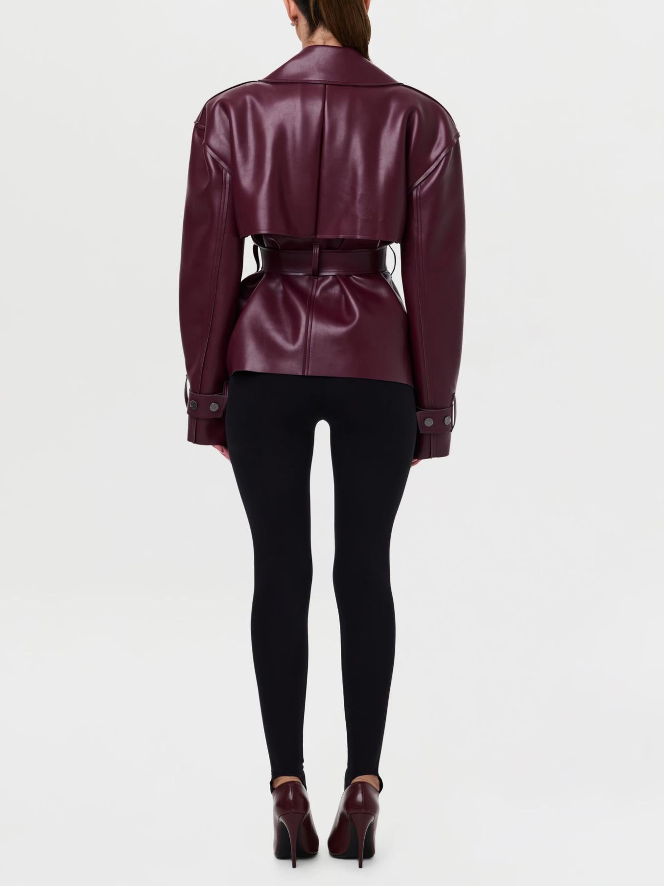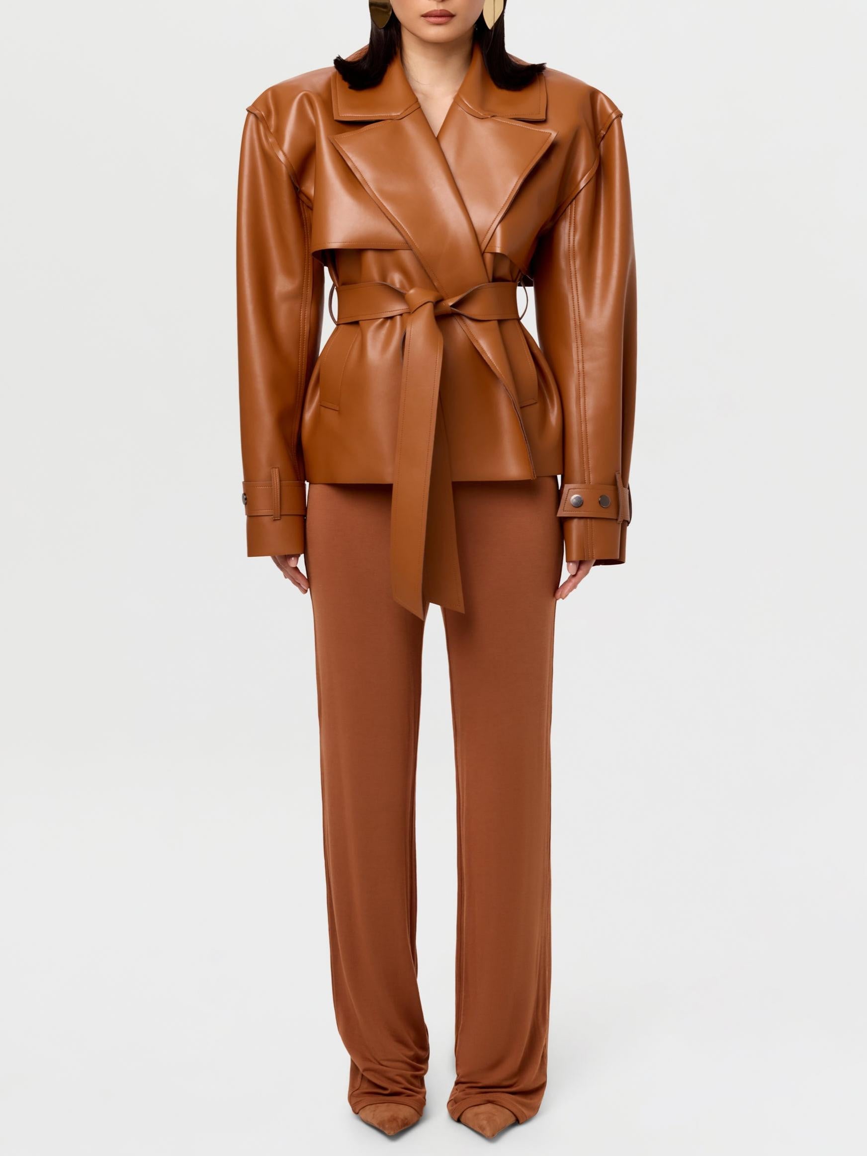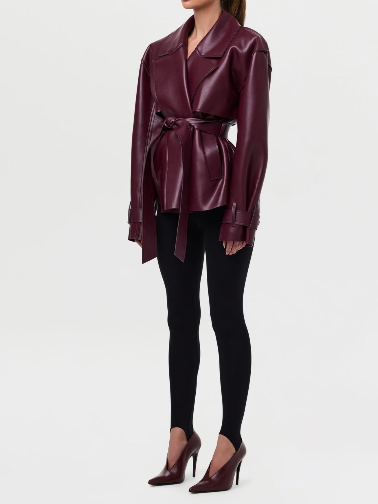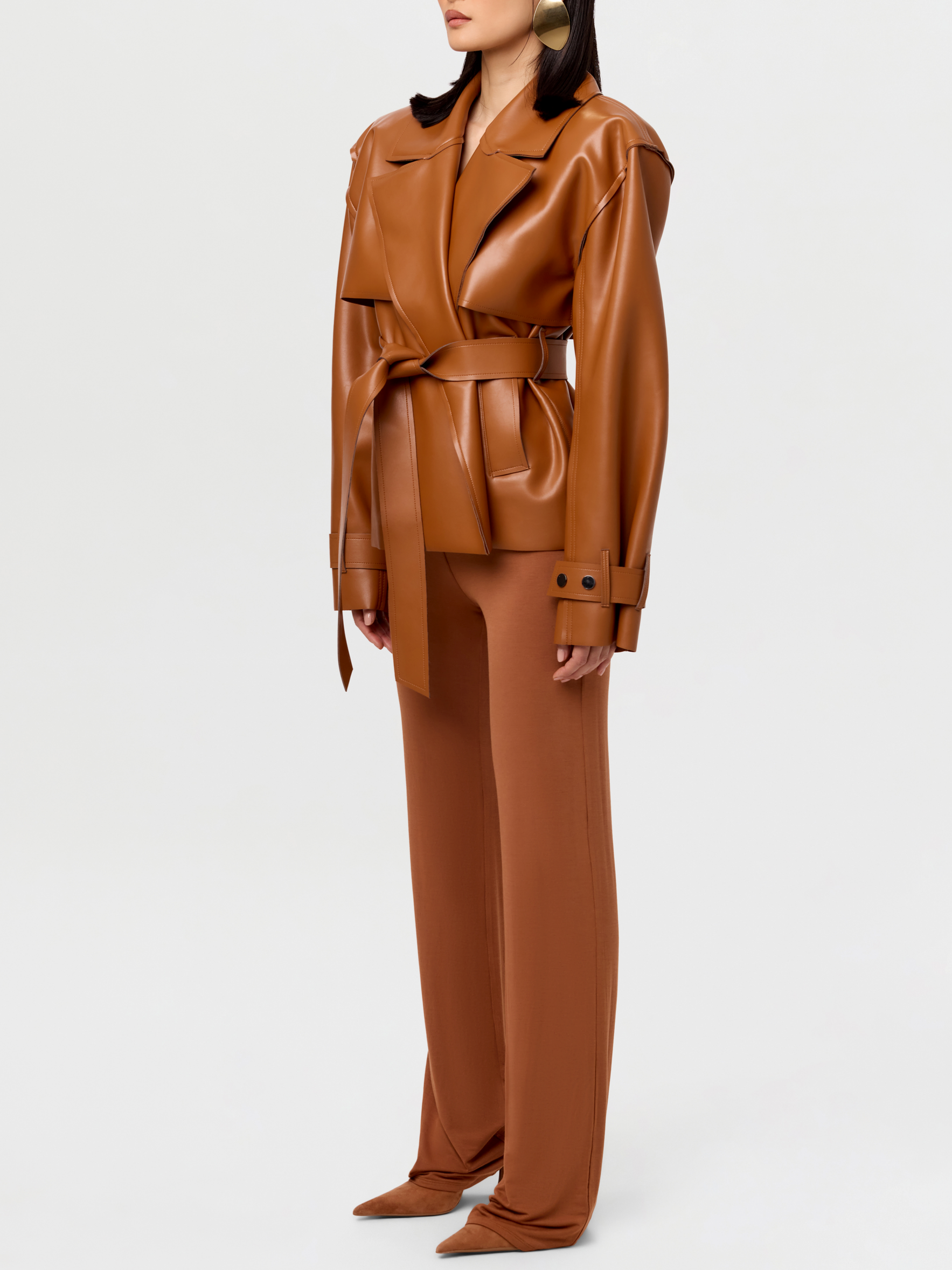 This leather oversized trench jacket is the perfect transition for the seasons. Designed with a luxurious smooth and buttery feel, notched collar and lapel, power shoulders, belted tie closure at the waist and back storm flap detail. Raw edge trim and adjustable hardware at the cuffs with loops complete the look. This is the perfect wardrobe staple to wear on rotation.
