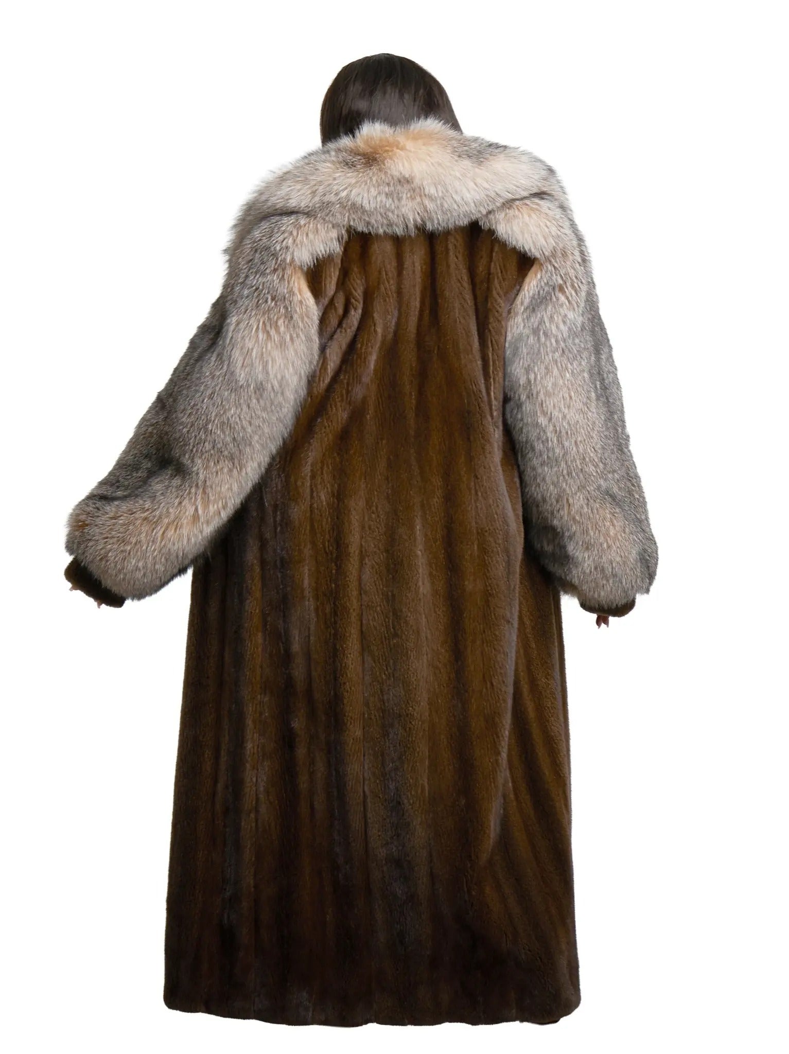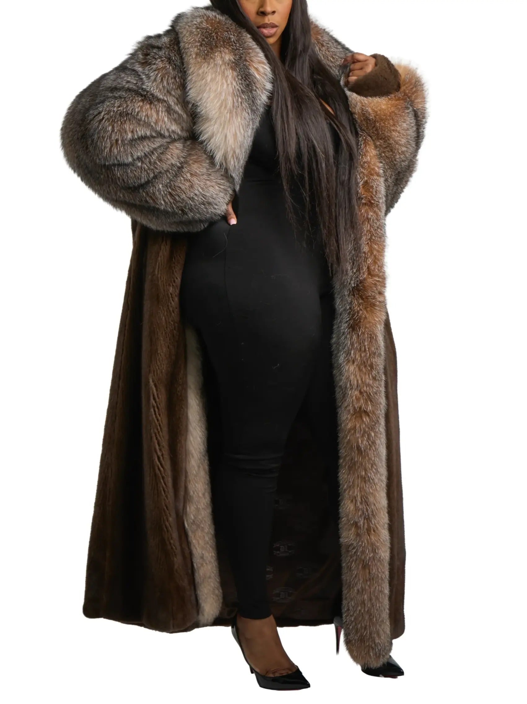 This full-length mink coat is designed with an opulent fox fur collar and front trim, creating a dramatic silhouette that embodies pure winter luxury. Crafted from premium mink, the body drapes with a smooth, elegant flow, while the voluminous fox fur framing adds dimension, warmth, and striking visual impact. The interior reveals rich, hand‑matched mink pelts that enhance movement and depth, making this piece a true statement of craftsmanship and sophistication.