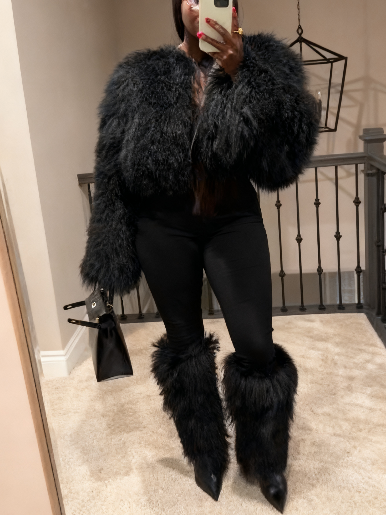 Be effortlessly fly in our gorgeous Cropped Mongolian Jacket. Wear her with your favorite jeans and boots to shine. This fur runs true to size. Model is 5'5'' 165lbs 36G bust and is wearing a size L for extra room.