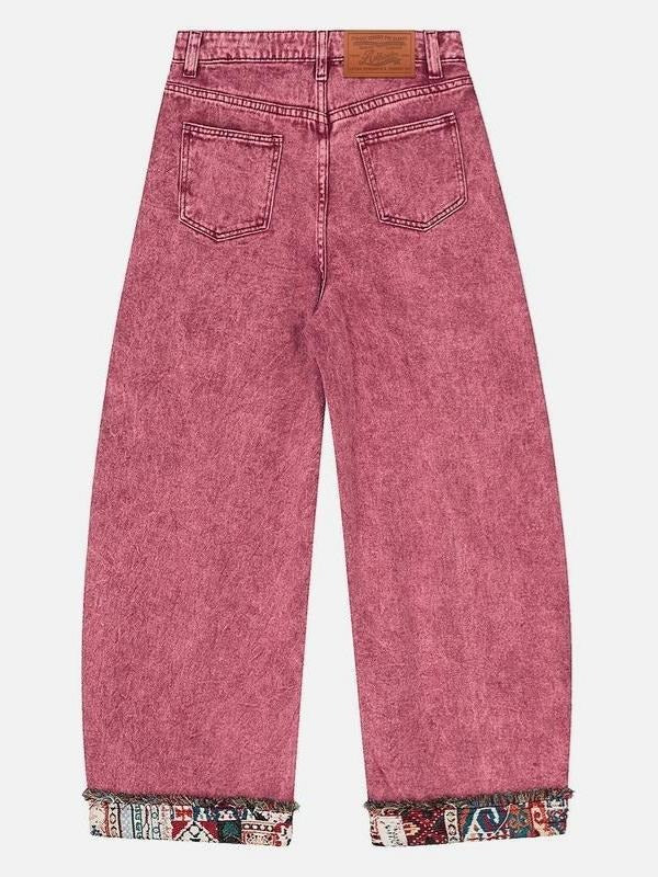 These barrel jeans are perfect for both men and women. Crafted with cultural heritage, these jeans feature hand-selected ethnic fabric patchwork. The washed fading and retro tones add a unique touch. Each pair is a story of bold visual contrasts.