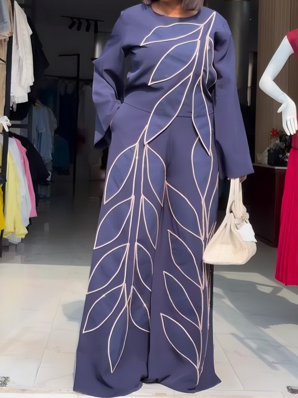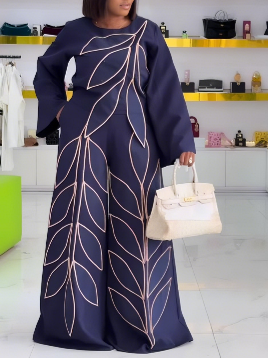 Elevate your wardrobe with this exquisite navy blue two-piece set that blends artistic design and elegant tailoring. Featuring a top with billowy sleeves and wide-leg pants, both adorned with intricate light pink leaf patterns, this ensemble is a true statement of style. The structured fabric ensures a polished look, while the loose fit offers exceptional comfort. Perfect for formal events, upscale gatherings, or when you want to make a sophisticated fashion statement, this set seamlessly combines artistry and wearability. Embrace the unique leaf detailing and timeless silhouette – a must-have for fashion lovers who appreciate bold yet refined design.