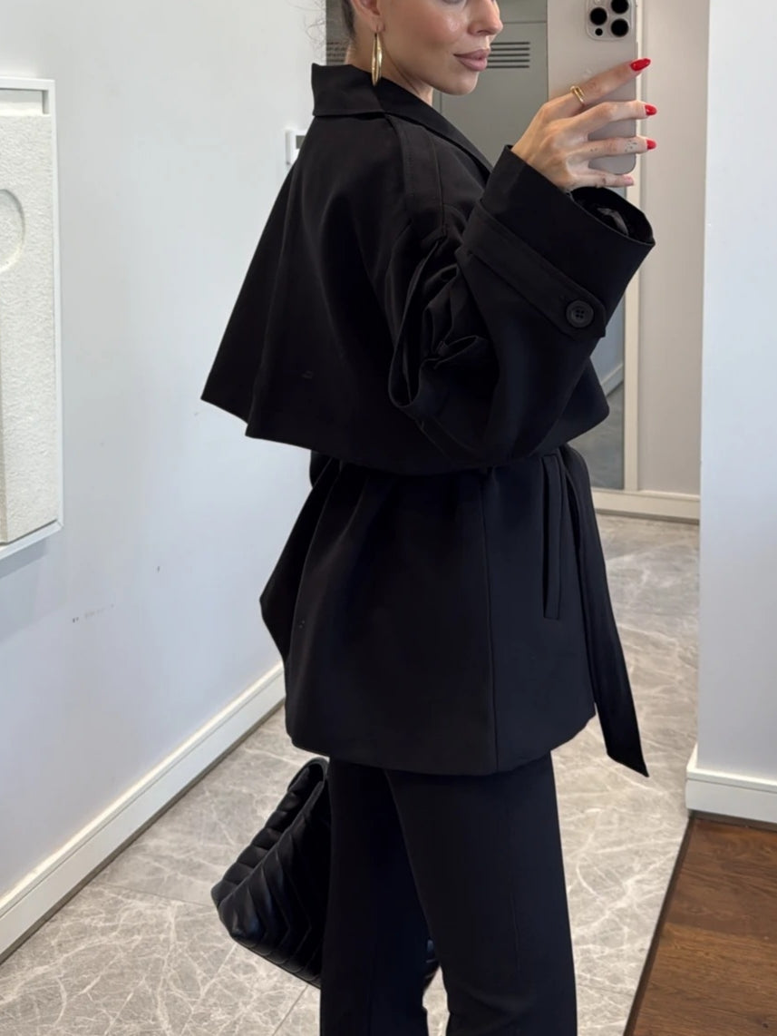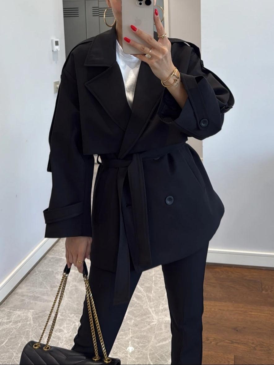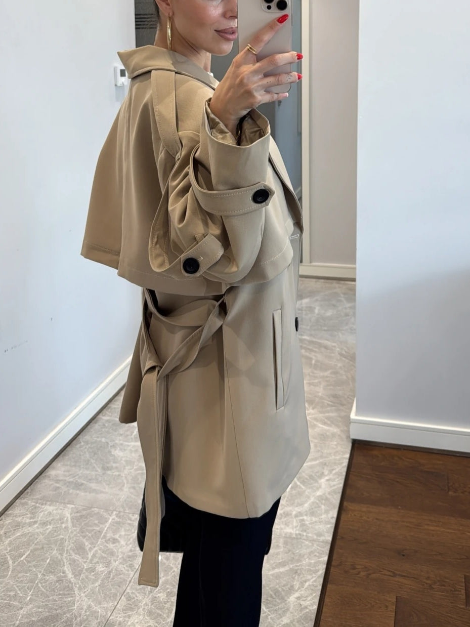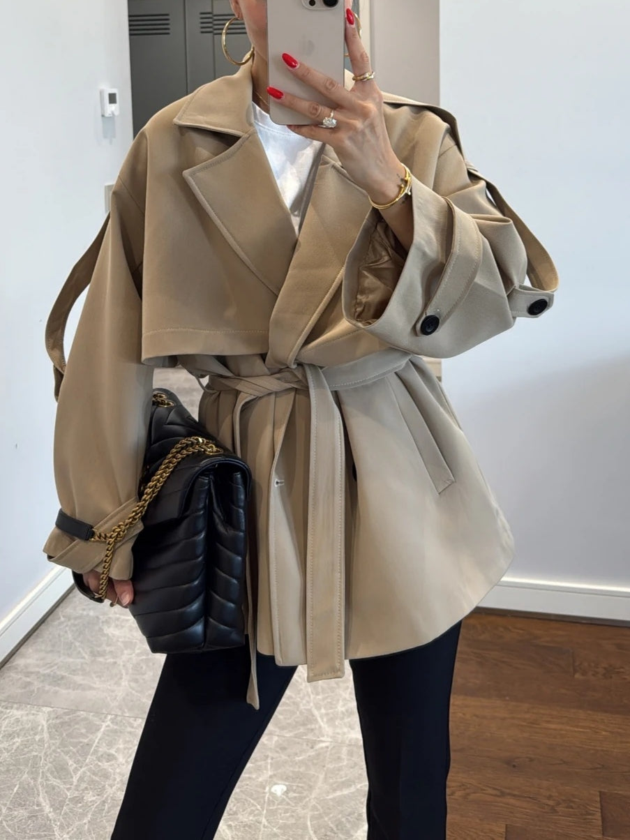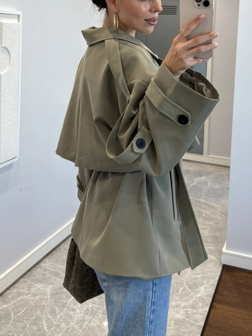 Offering a modern, urban chic vibe, this oversized trench coat creates a powerful silhouette with its dropped shoulders and wide collar. Its relaxed fit makes it perfect for any occasion, from casual outfits to office wear.