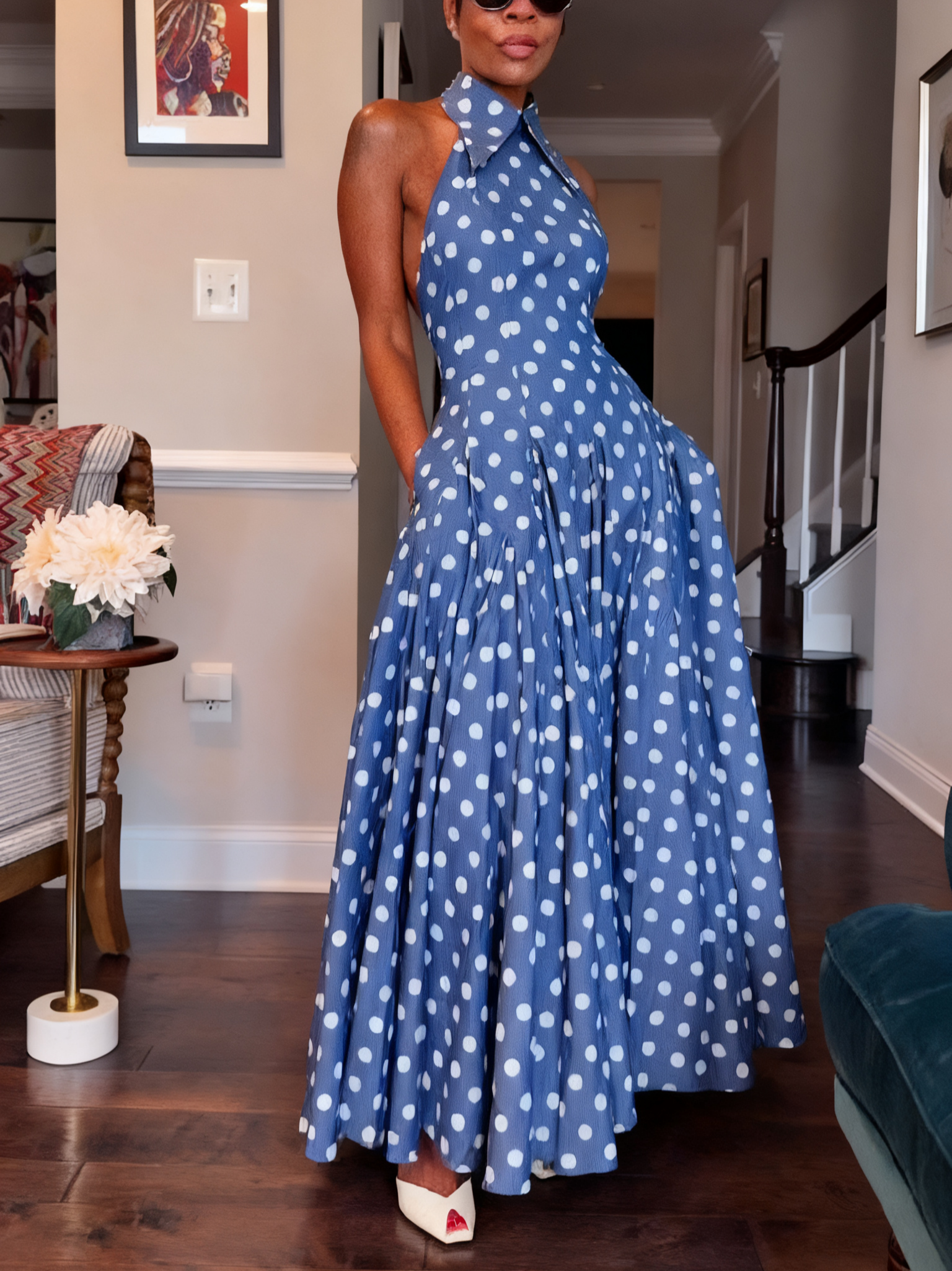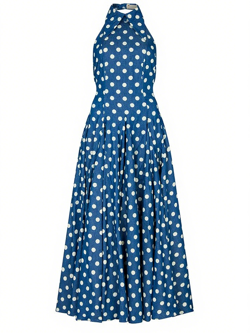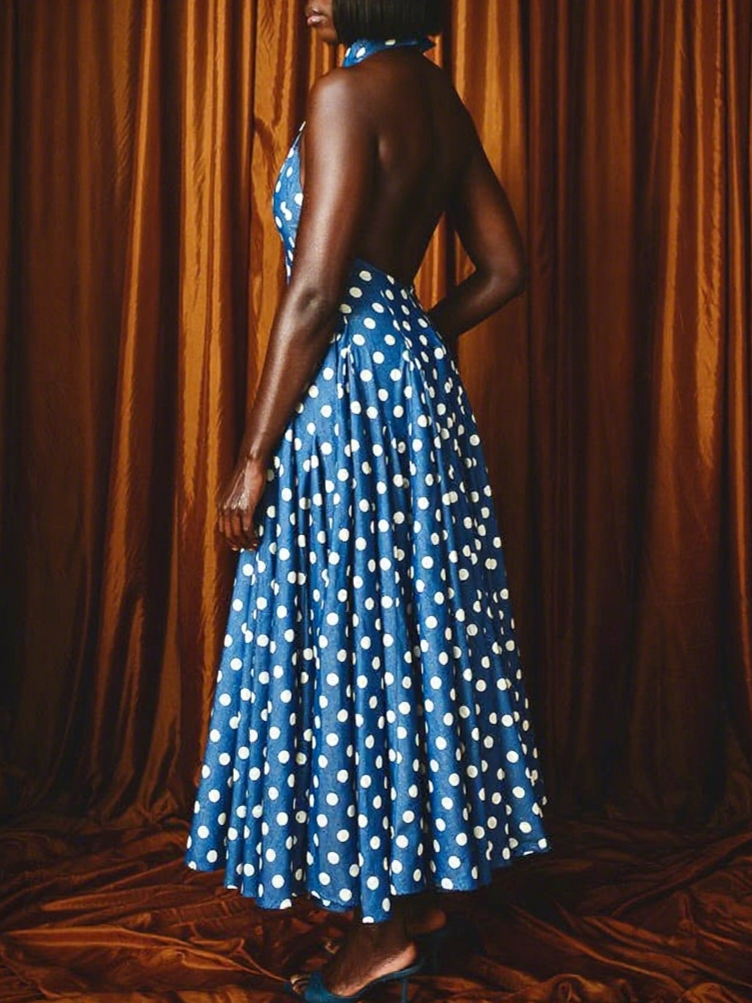 PolkaDot Denim Backless Midi Dress