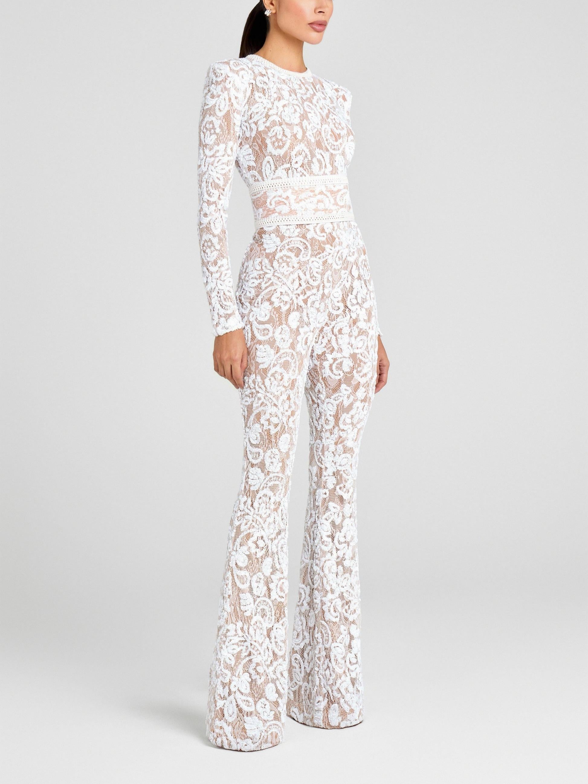 Turn every entrance into a moment with the Black/White Floral Lace Jumpsuit, a elegant piece that redefines eveningwear. Crafted from sequin-embellished floral lace with a sultry nude lining, this jumpsuit is all about confidence and allure.