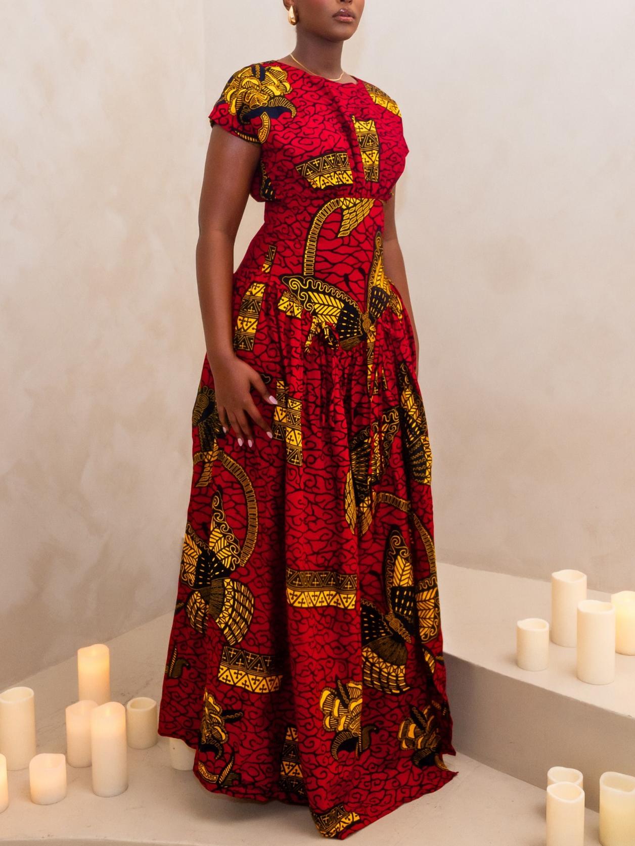 The Maxi Dress is all about effortless elegance. With a softly rounded neckline and flattering short sleeves, this dress frames your silhouette in the best way. Crafted in vibrant African print, it features ruched detailing at the bust for added shape and an adjustable front slit for just the right amount of leg – effortlessly transitioning from refined to striking.