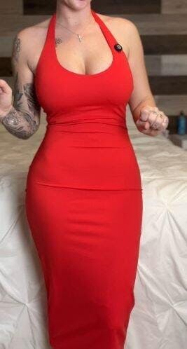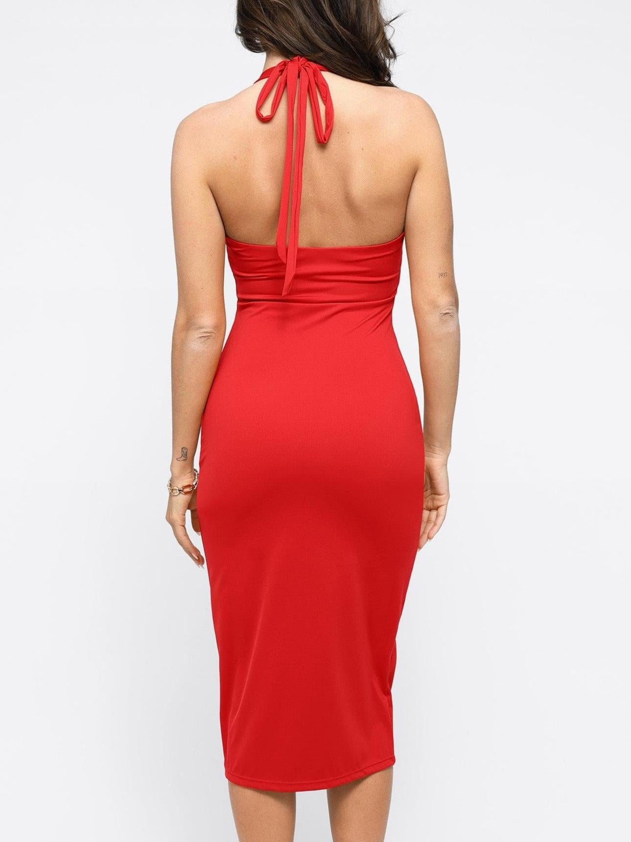 Crafted from a buttery-soft, stretchy fabric that hugs your curves in all the right places, this dress features a striking halter neck (with a self-tie back for a customizable fit) and a daring keyhole cutout at the bust. The midi length falls to a flattering knee-grazing hem, while the solid scarlet hue adds timeless, eye-catching vibrancy.