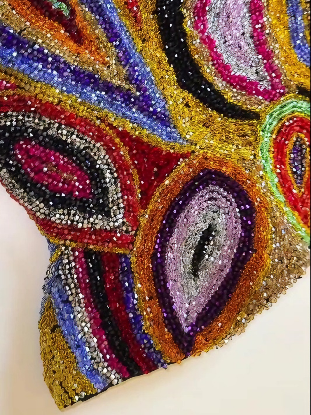 - Details: Hand-beaded abstract swirl pattern, rhinestone accents