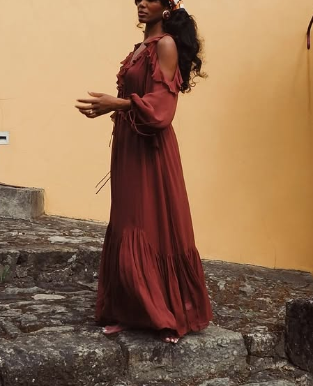 Rustic Charm: Elegant Burgundy Maxi Dress with Ruffled Sleeves