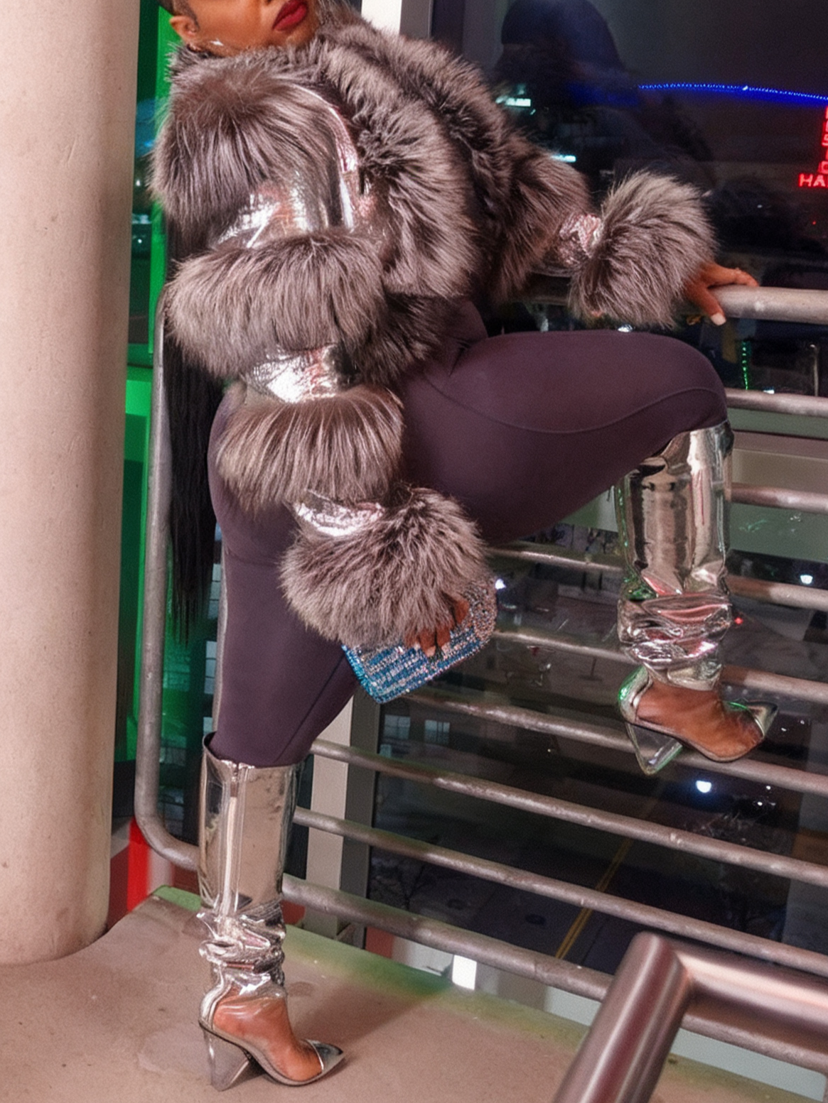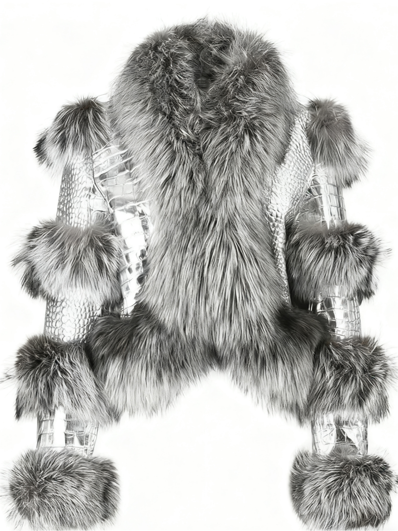 Silver Croc - Embossed Leather & Grey Fur Cropped Jacket