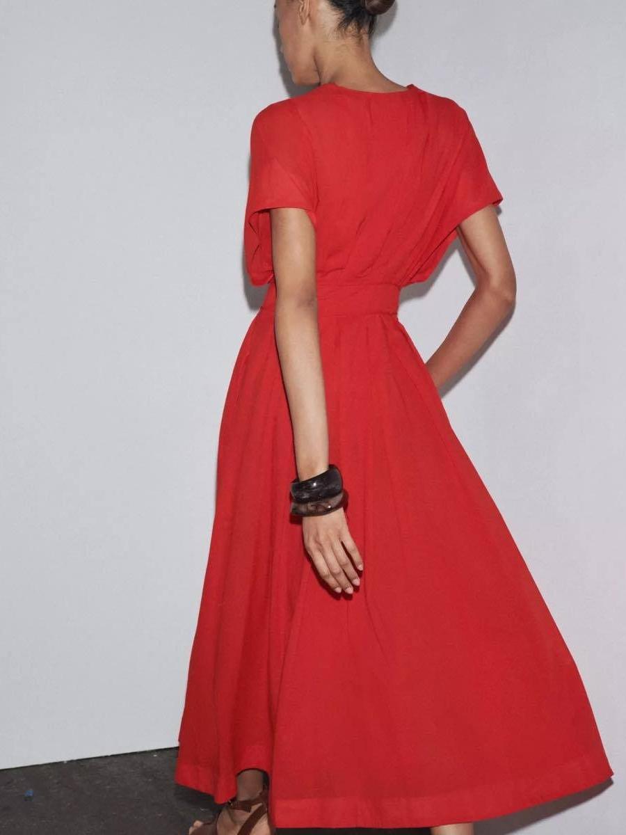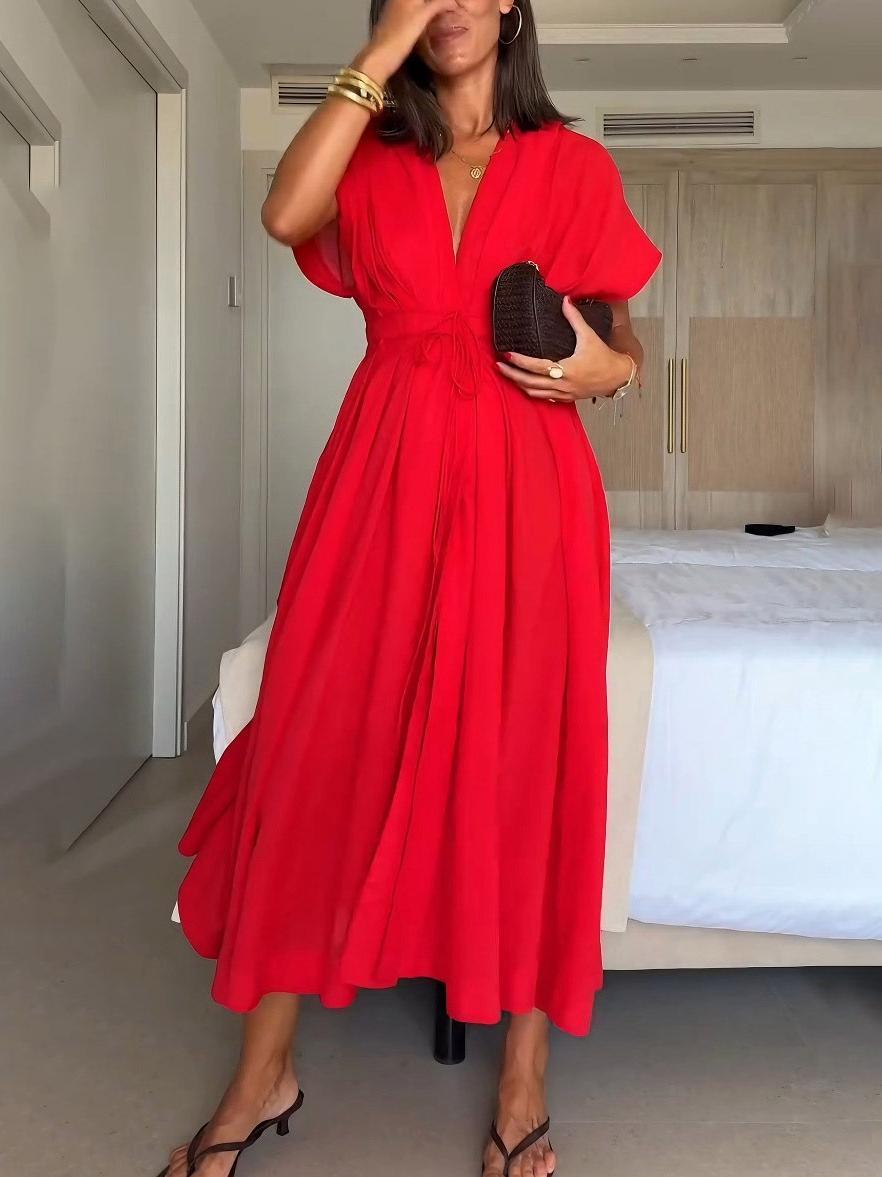 This elegant V-neck, drawstring-pleated midi dress is refined and feminine, perfectly blending comfort and sophistication.