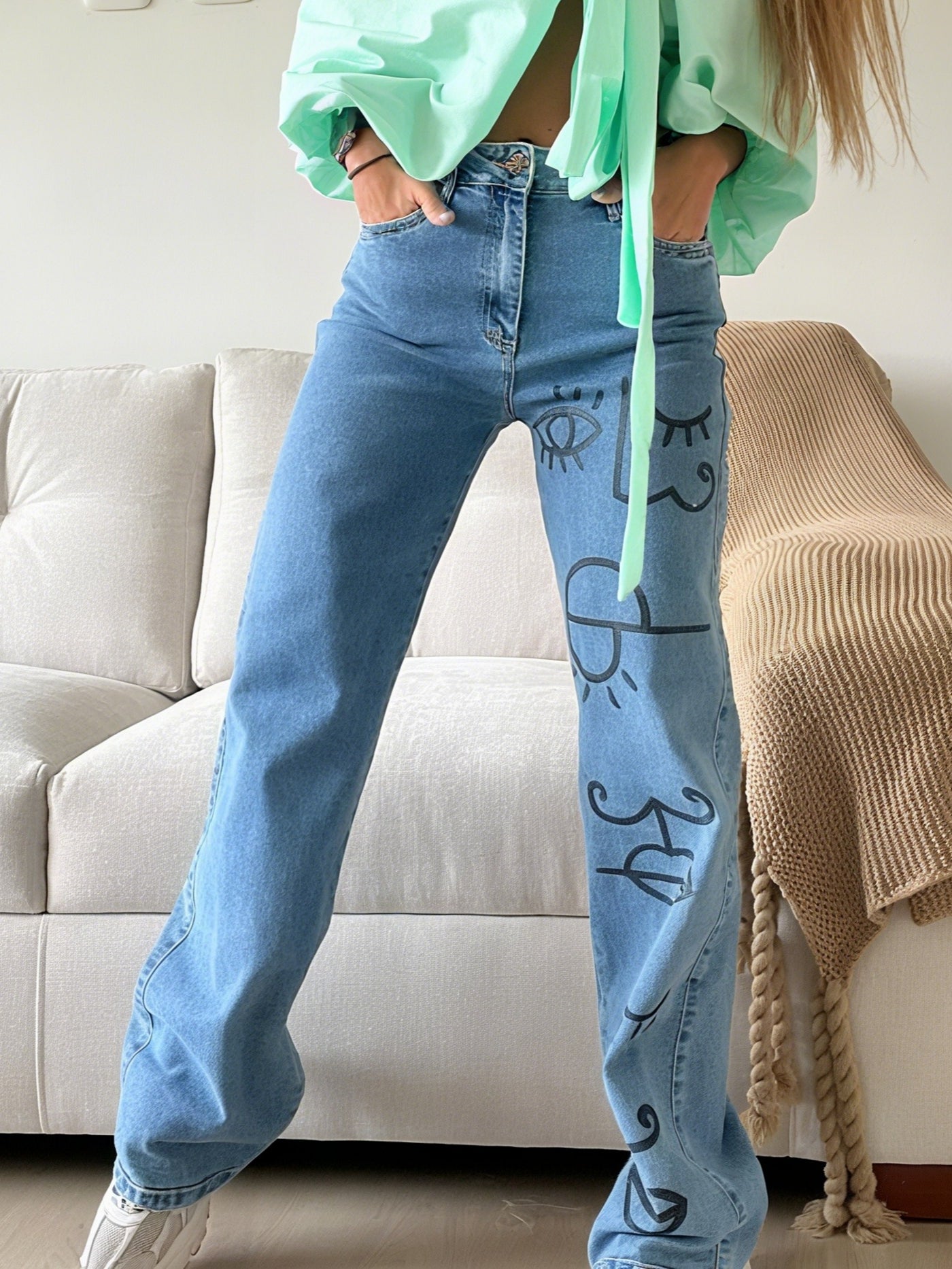 Stylish Blue Jeans Featuring Artistic Black - Ink Drawings