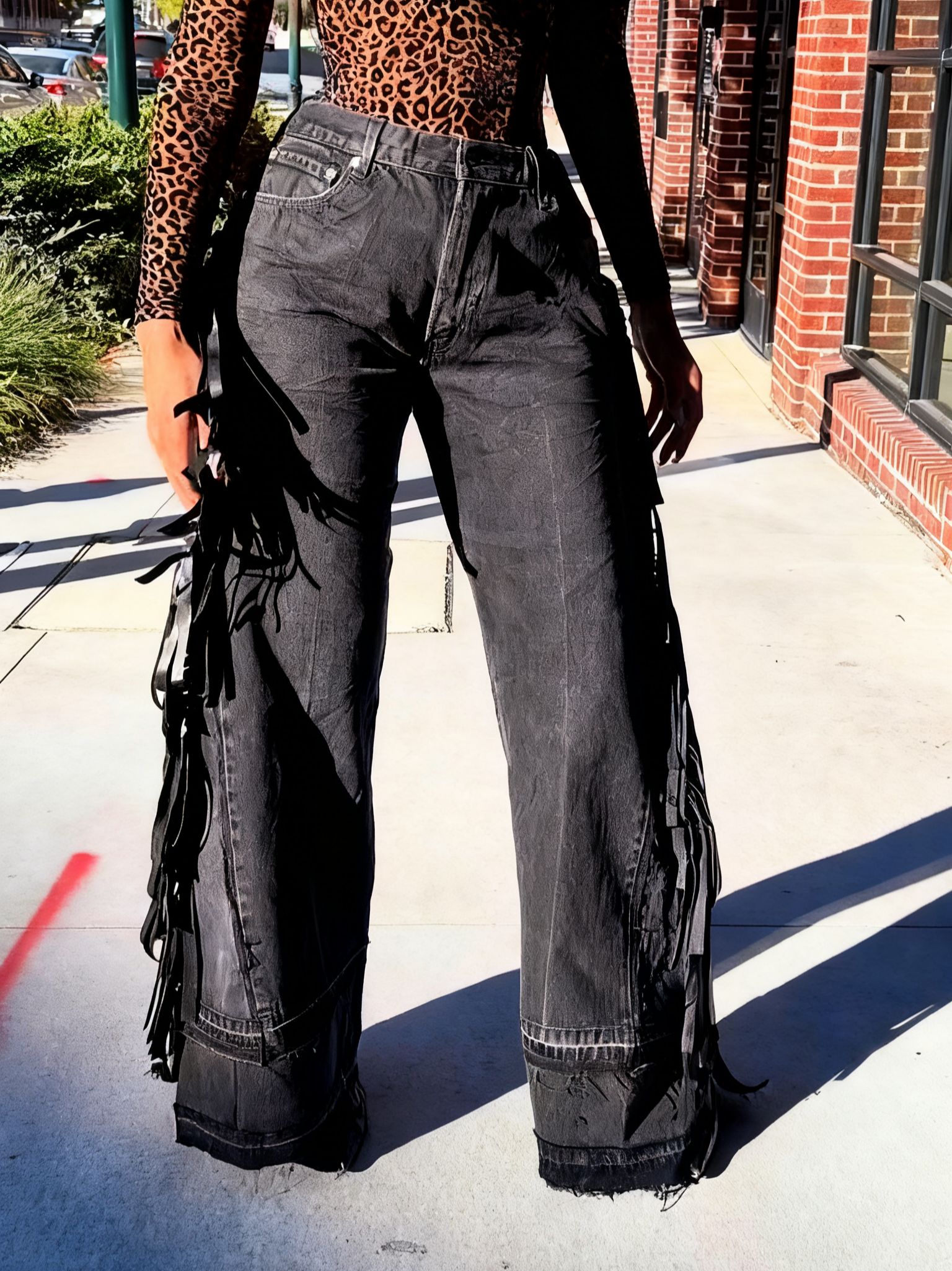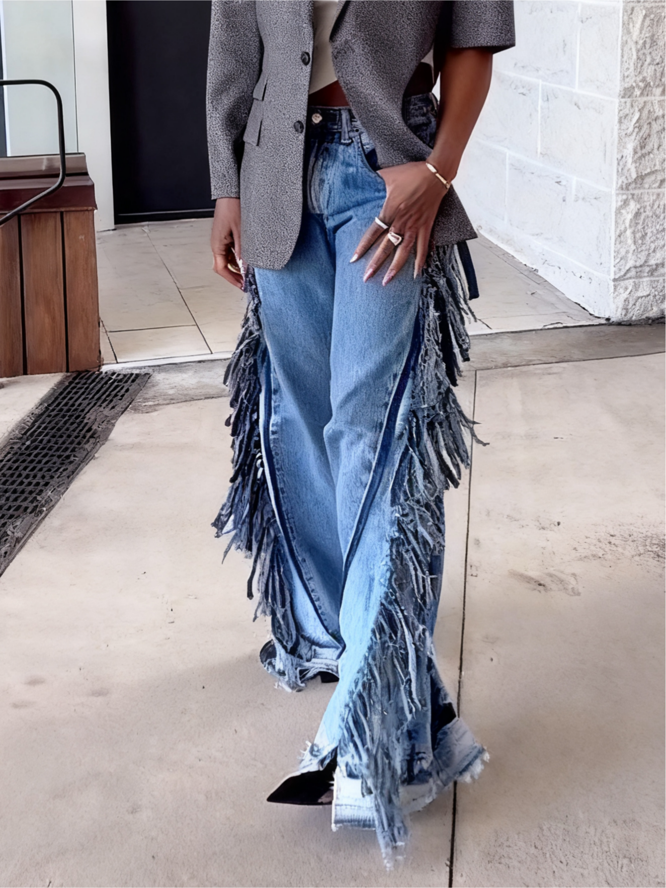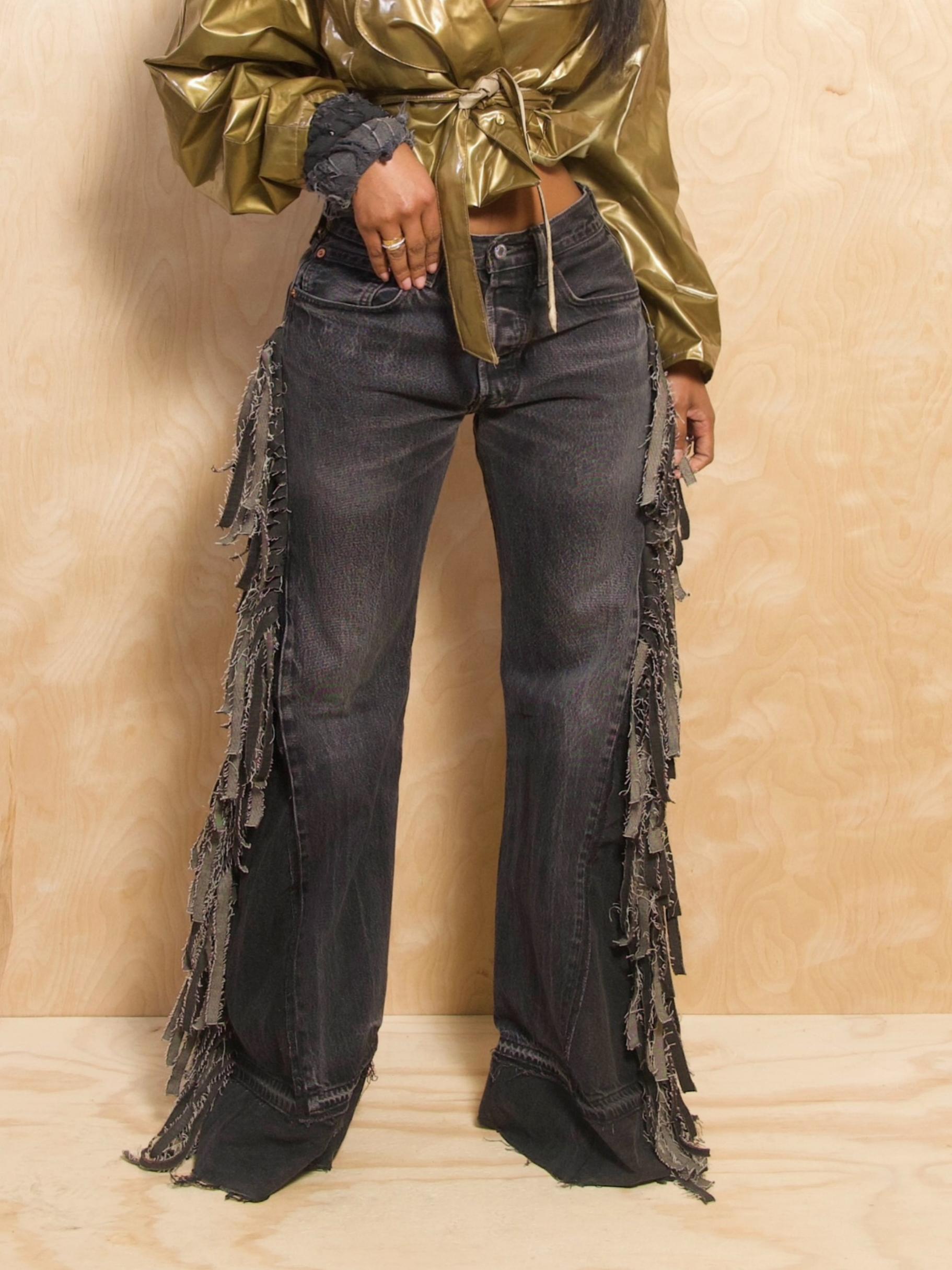 Make an entrance in our Classic Denim Wide Leg Fringe Jeans, where timeless vintage denim meets modern artistry. The classic mid-blue/Black wash enhances their versatility, making them easy to dress up or down. Designed with a wide-leg cut, they bring both comfort and bold style to your look. Each pair carries a unique story as they are handcrafted from vintage denim, making no two exactly alike. A true statement piece, they effortlessly combine sustainability and style in one perfect package.