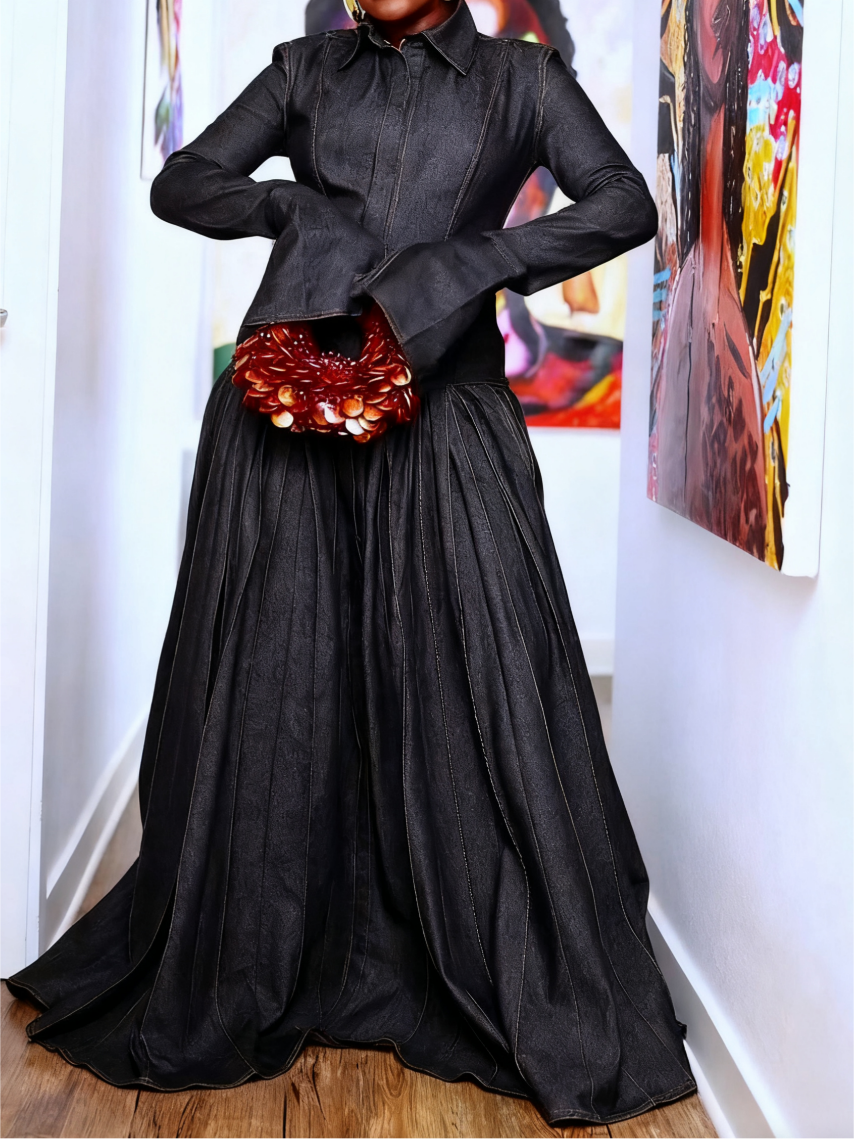 Fitted denim gown with a low waistline and a pleated flared bottom for an elegant silhouette. This chic design blends timelessrn sophistication, featuring long sleeves with exaggerated cuffs.