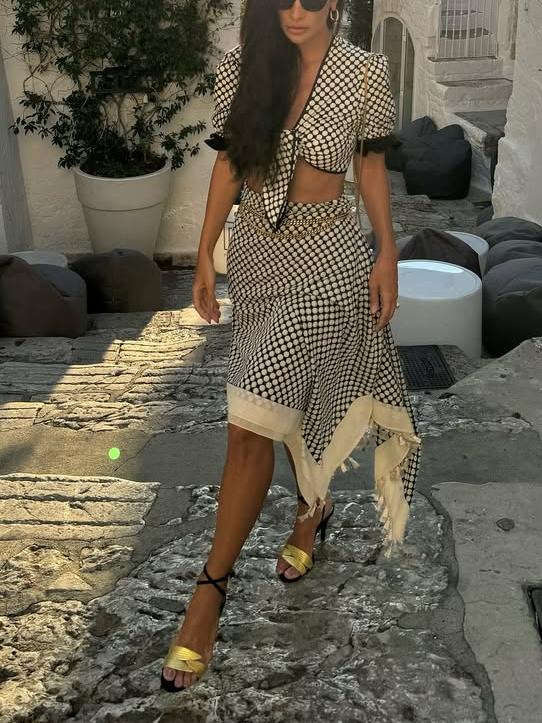 Stylish Polka - Dot Two - Piece Dress Set with Crop Top and Midi Skirt