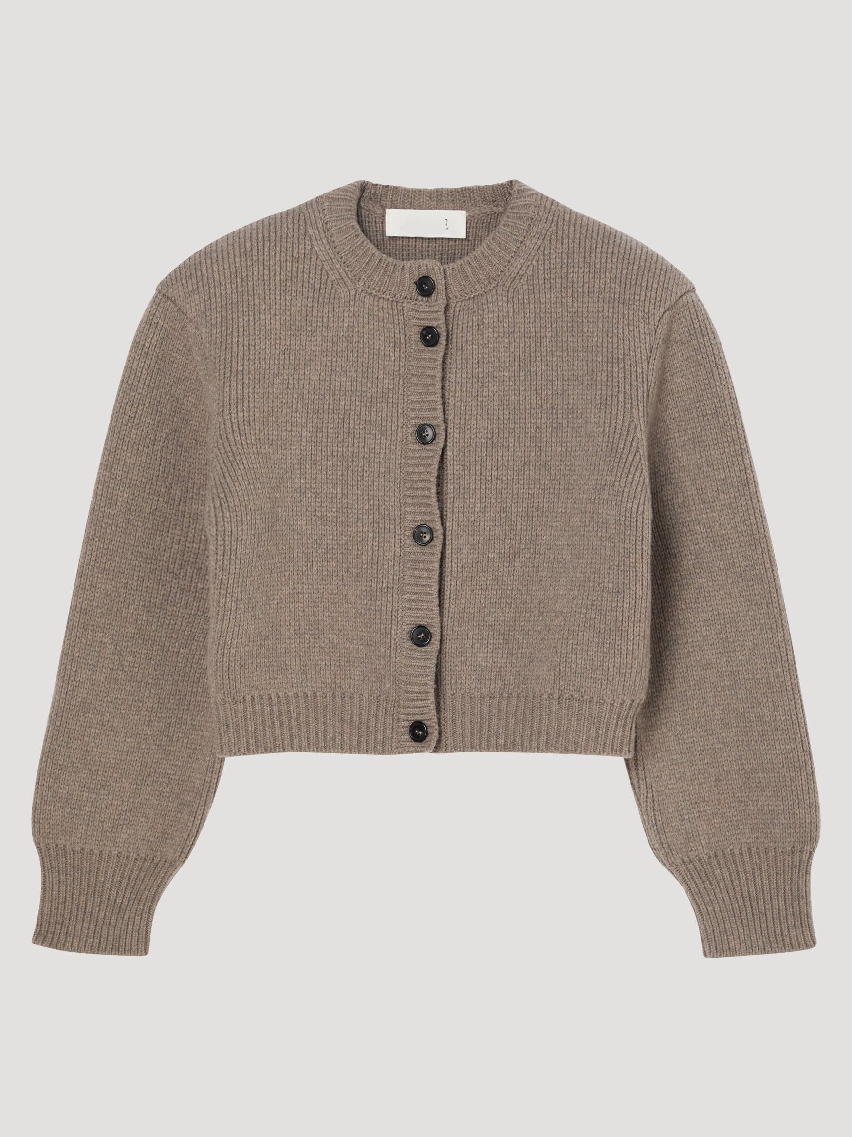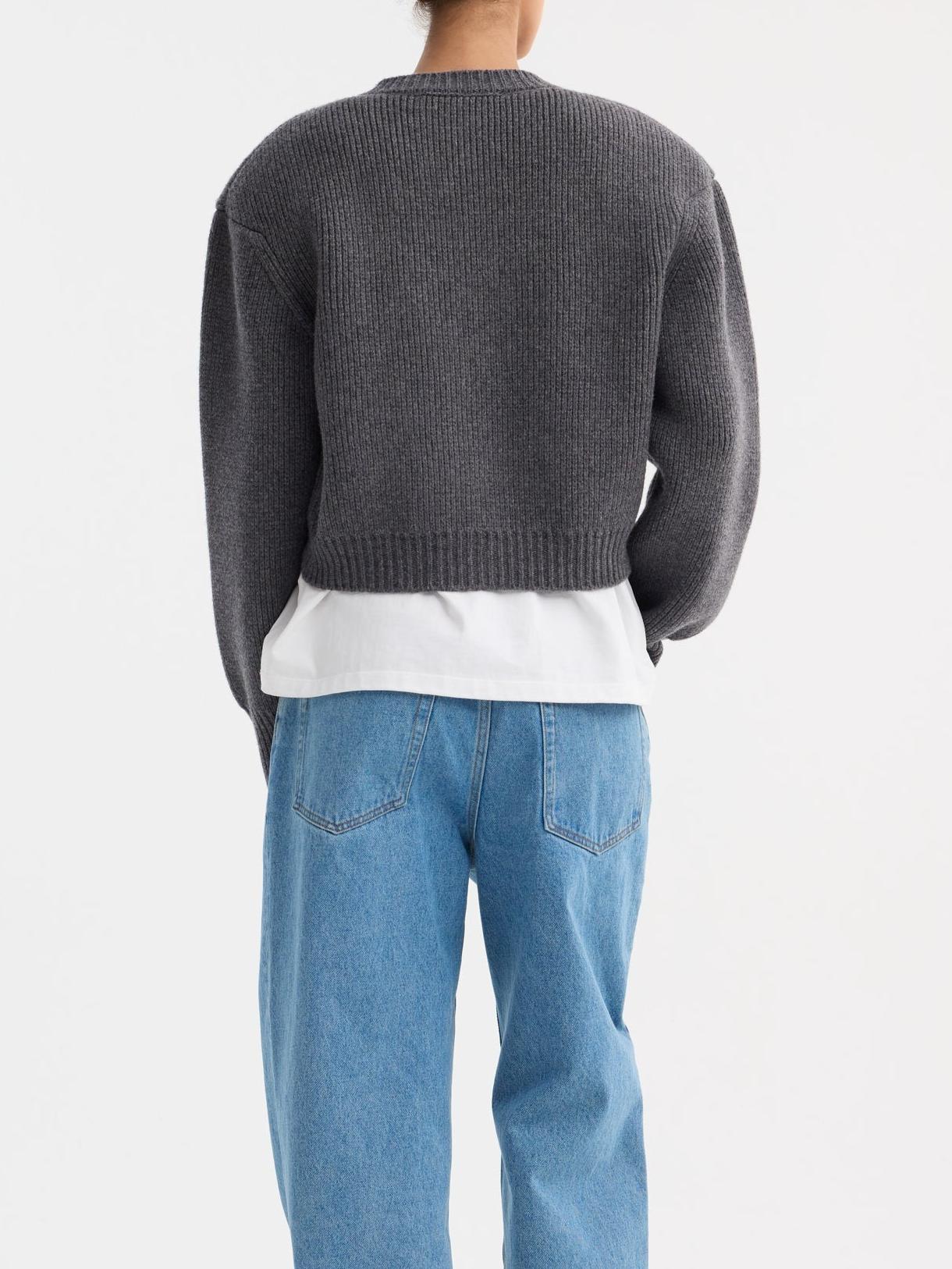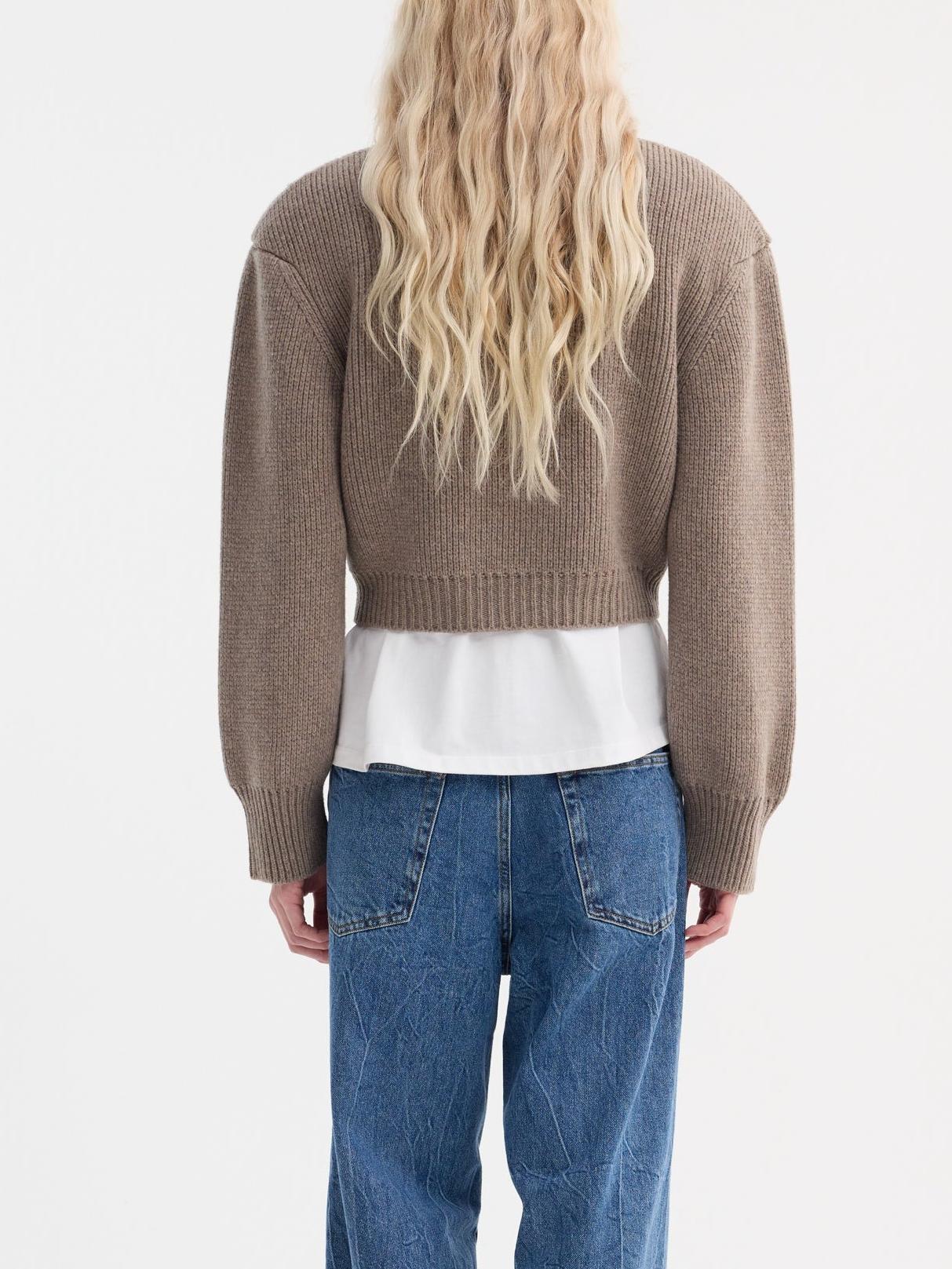 A sculptural update on the classic cardigan, creating balance between softness and architectural shape. A piece that reinterprets knitwear through a sharp and structured shoulder with an oversized fit.