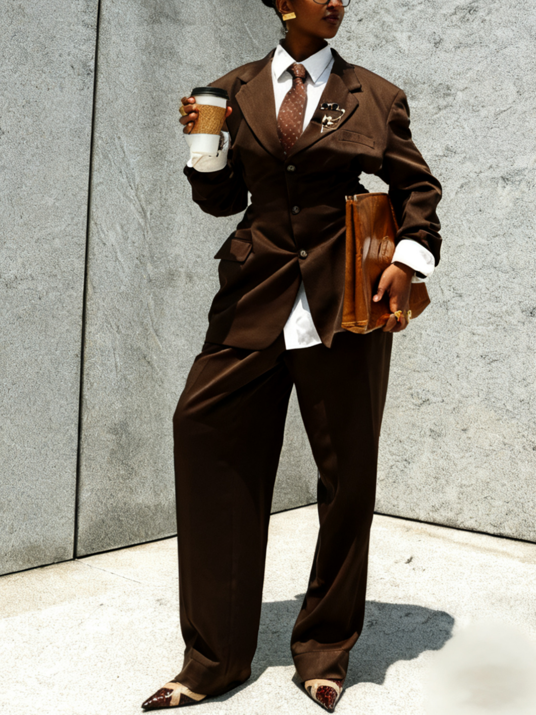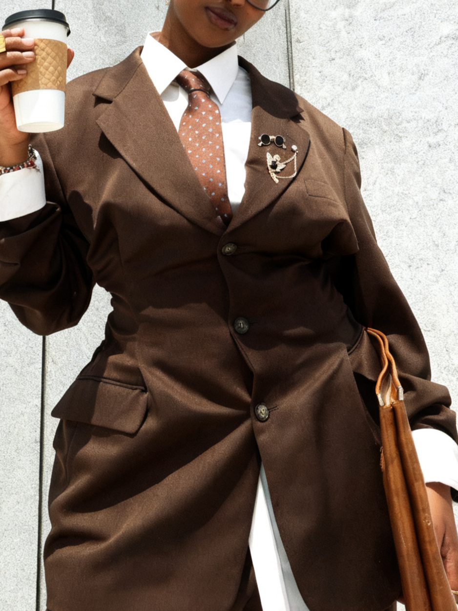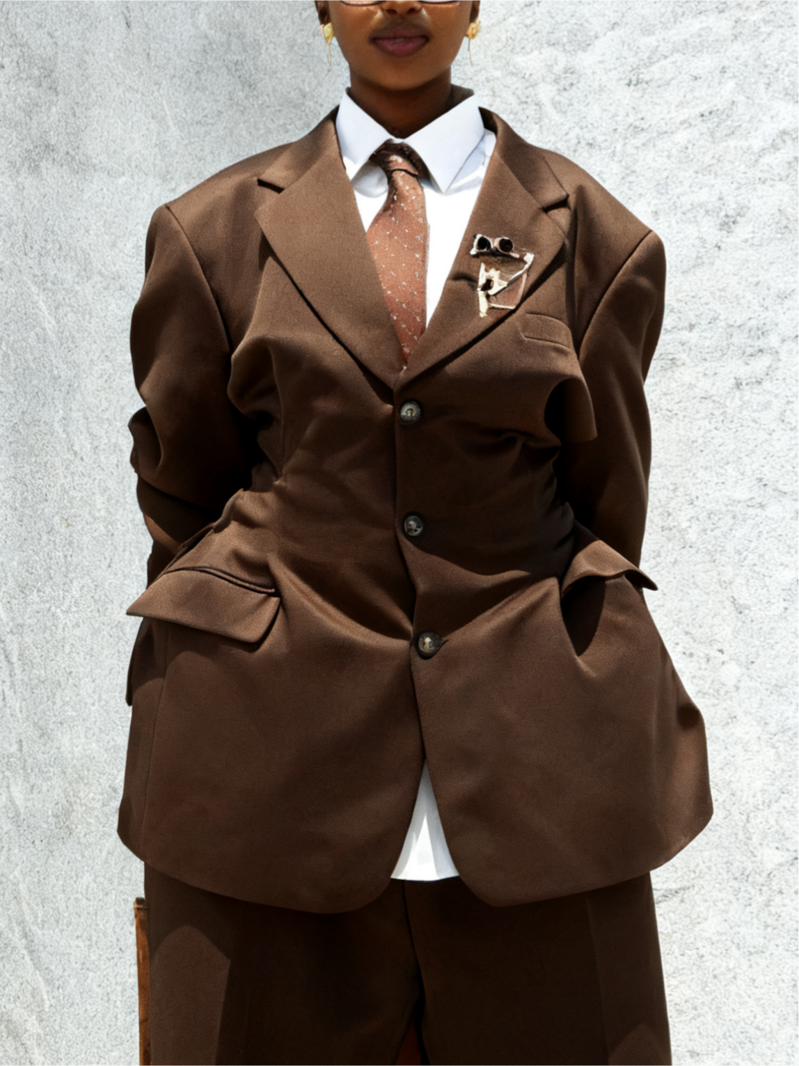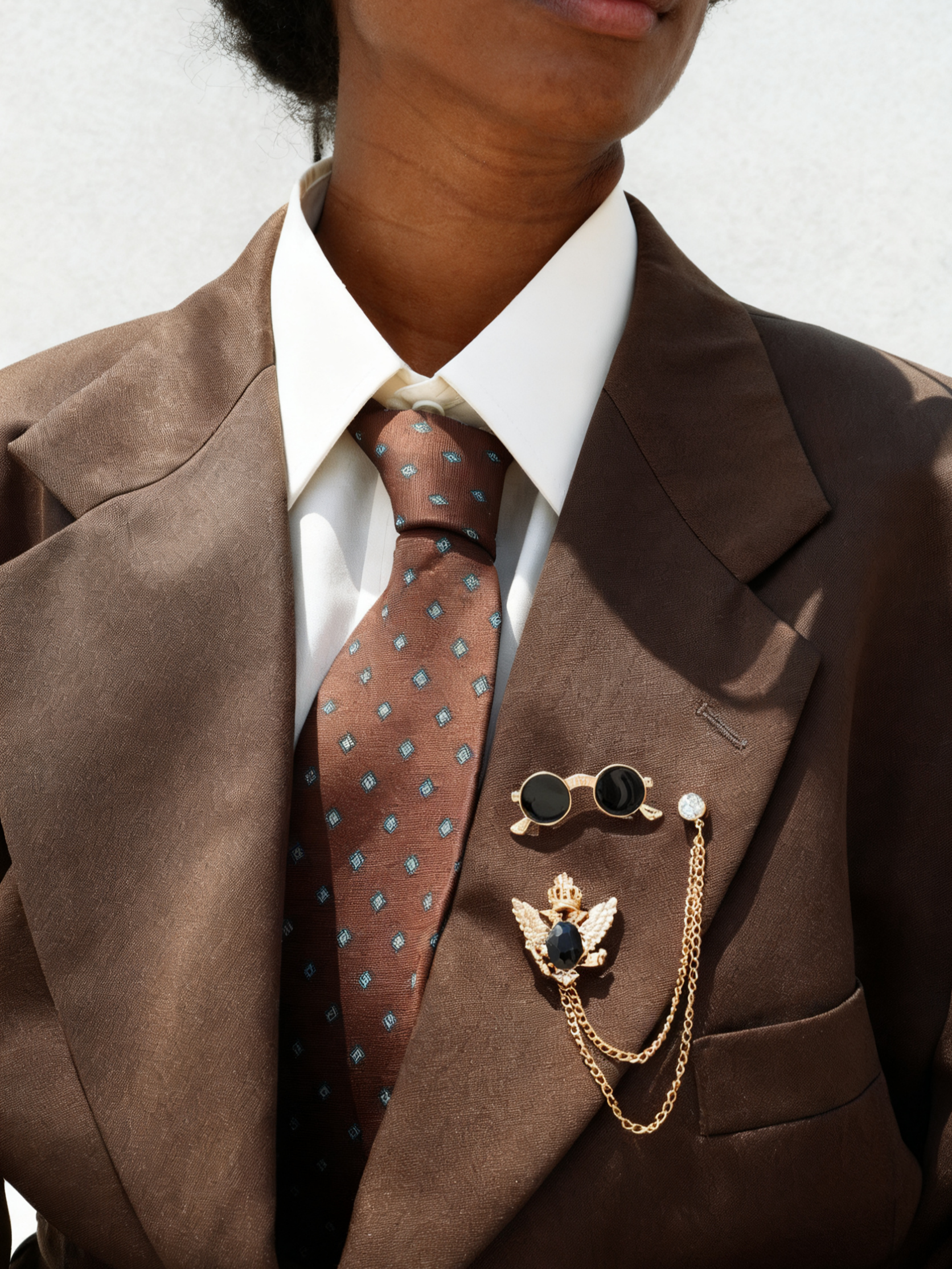 The suit set is a one-of-one reworked vintage suit sold exactly as styled, including the tailored blazer, wide-leg trousers, patterned tie, and gold-tone brooch. Designed for structure and edge, it features strong shoulders, clean lines, and a deep brown tone that makes a bold statement.