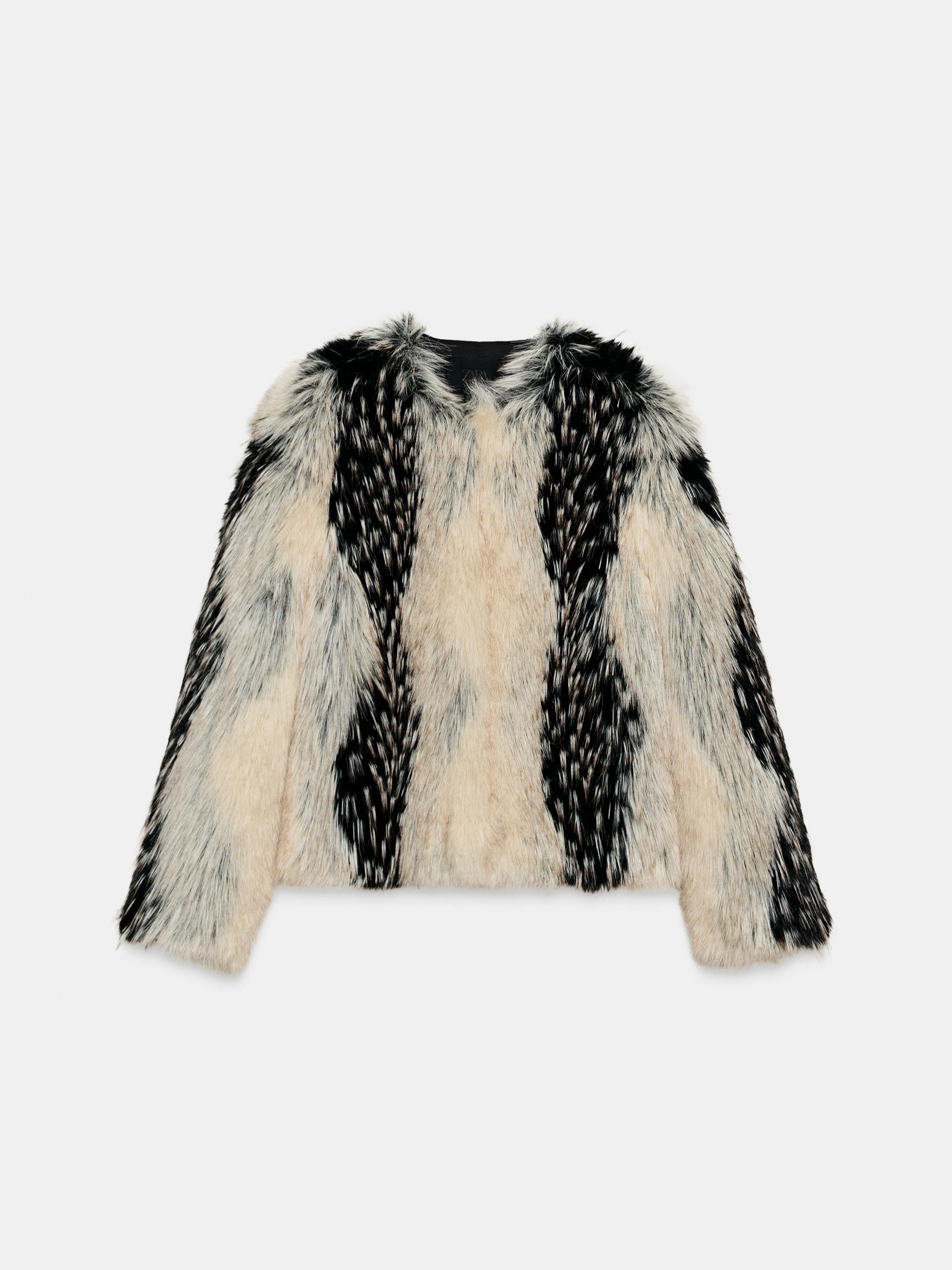 Round neck, long sleeve short coat. Hidden in-seam side pockets. Contrast interior lining. Front closure with hidden hooks.