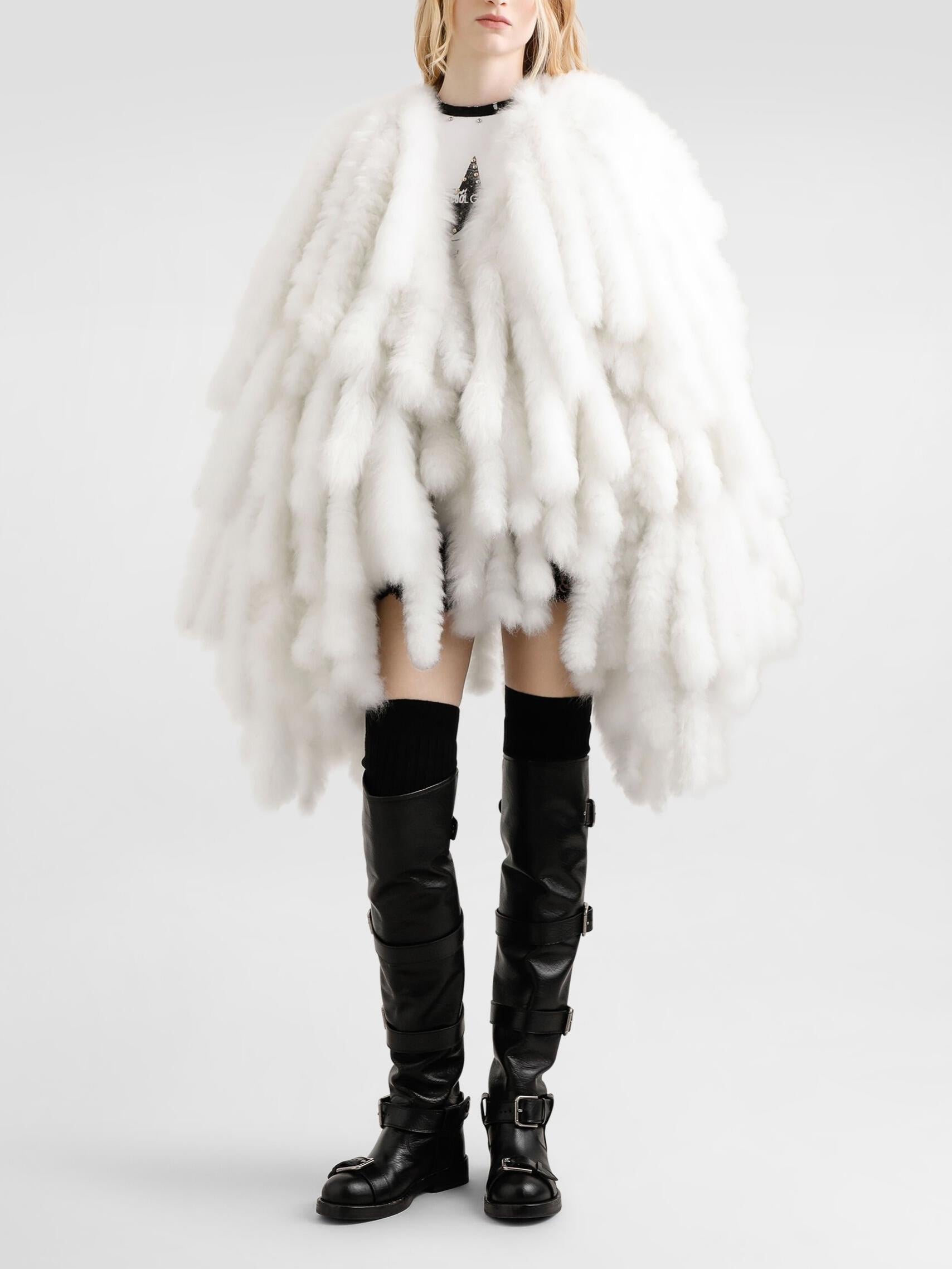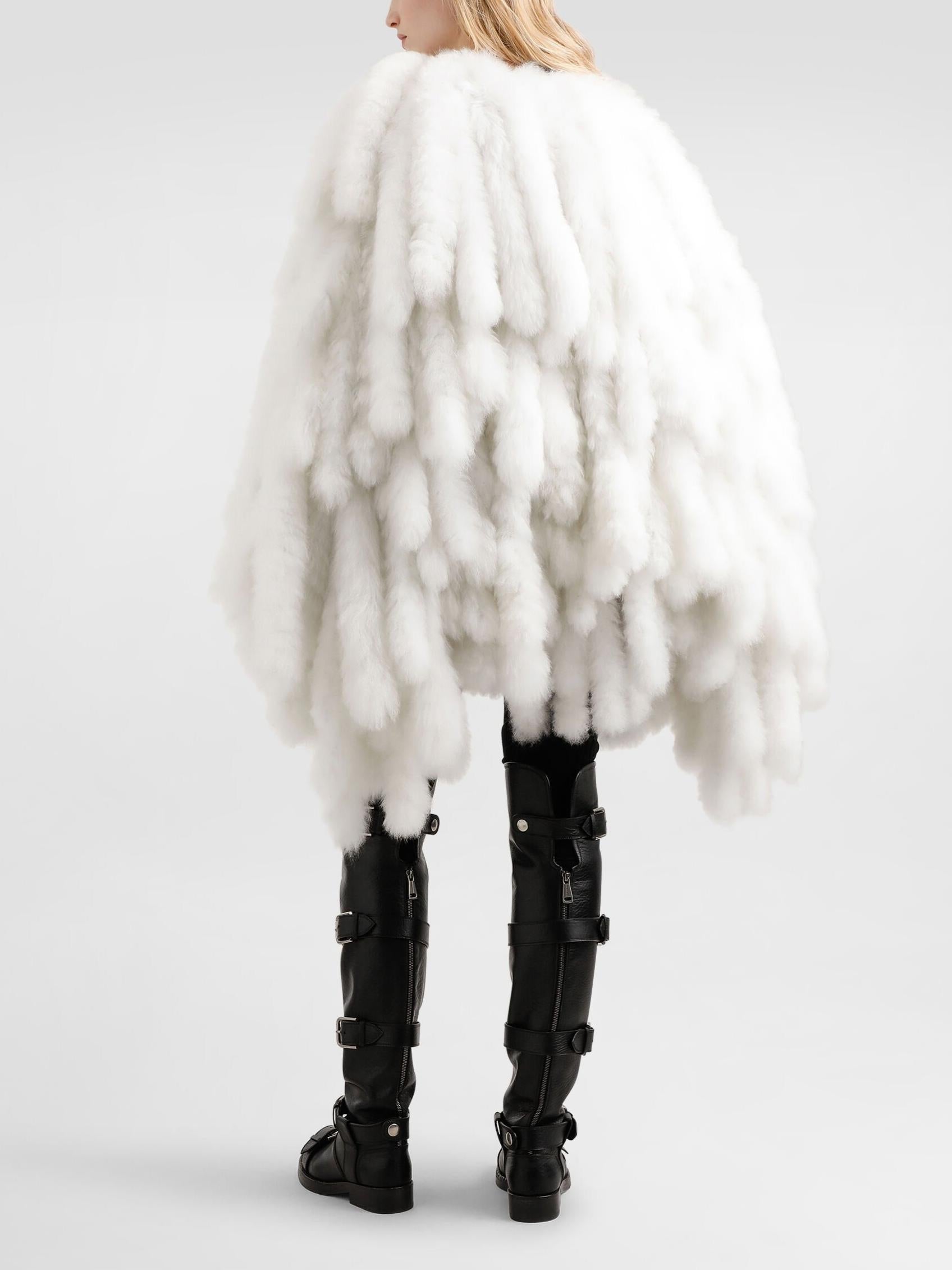 Crafted from ultra-plush, cruelty-free faux fur that mimics the softness of real fox fur, this dramatic cape features vertical panels that cascade into a fluid, wing-like silhouette. Its open-front design and oversized, drapey cut create an ethereal, almost weightless look, while the premium fabric delivers luxurious warmth for cool evenings.